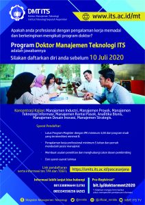 Technology Management Department Institut Teknologi Sepuluh Nopember proudly present a new doctoral program which has a slightly different orientation from conventional doctoral programs. The Technology Management Doctoral Program (DMT) follows the model of Doctor of Business Administration (DBA) that is widely held by advanced universities abroad. The focus is on research in certain fields that have high relevance to complex field problems that are solved using systematic and academically tested methodologies. Applicants to this program can come from professionals and academics with specific work experience.