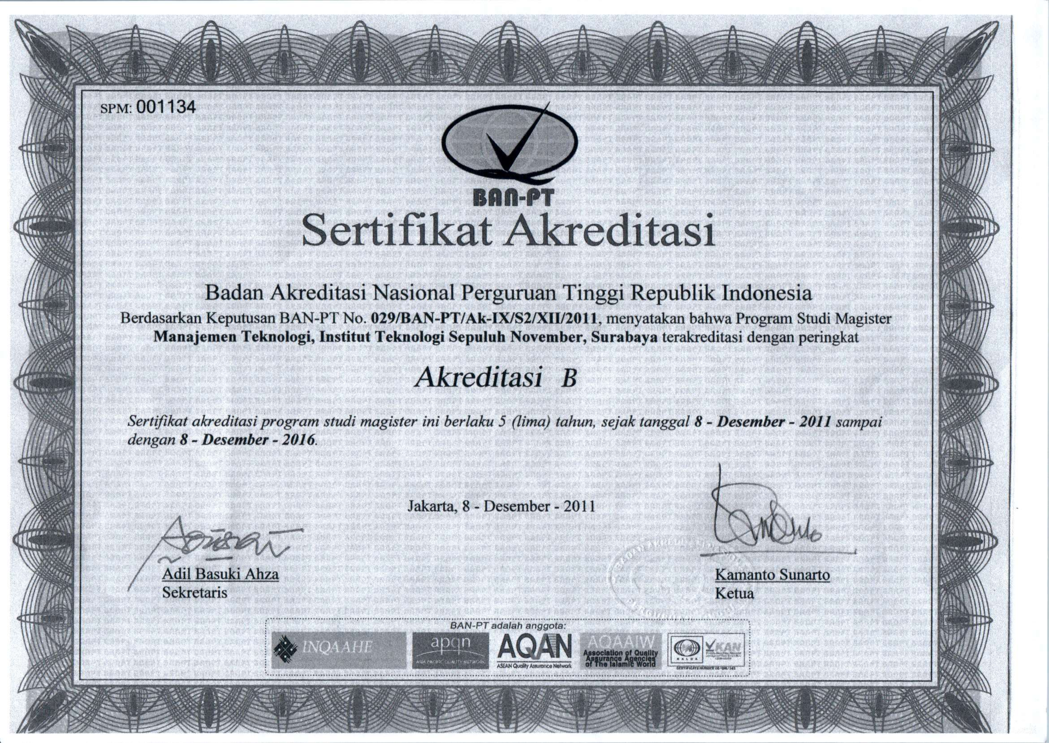 Institut Teknologi Sepuluh Nopember sebagai tempat bernaung Departemen Manajemen Teknologi telah terakreditasi A oleh BAN-PT.