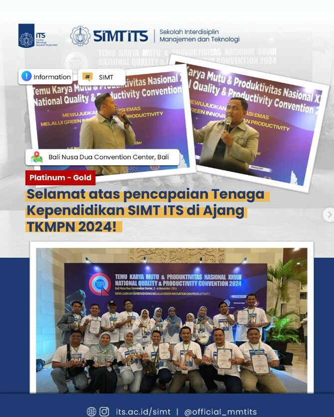 Prestasi Gemilang di TKMPN 2024! Bangga! Aziz Hakim Astqolani dan Wahyu Aditya Rahman, tenaga kependidikan SIMT ITS, berhasil membawa pulang medali platinum dan emas di ajang bergengsi Temu Karya Mutu dan Produktivitas Nasional (TKMPN)...