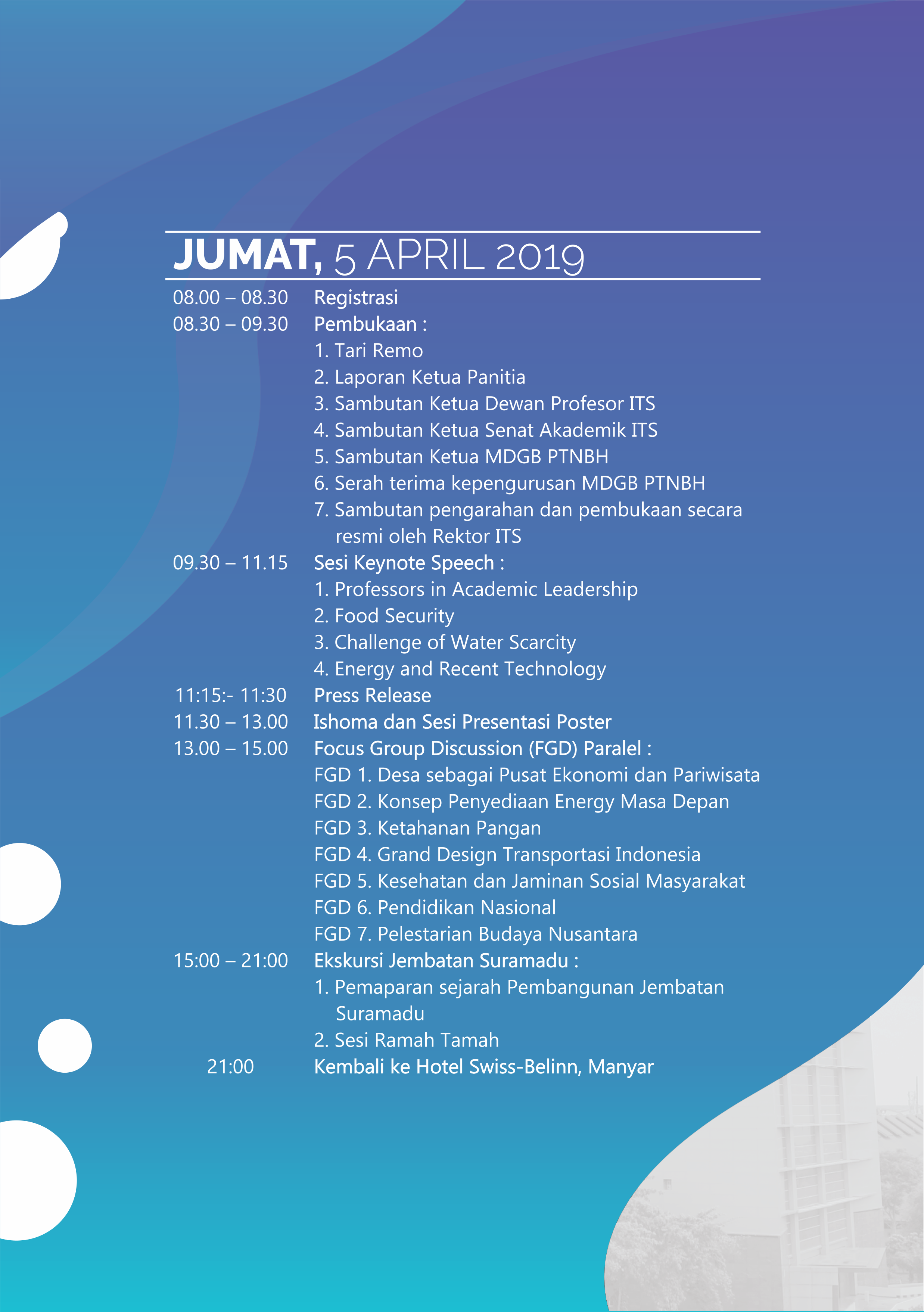 Invited speaker dan peserta FGD diharuskan untuk mengumpulkan makalah secara online melalui tautan berikut ini. Selain itu konfirmasi kesediaan mengikuti ekskursi ke Jembatan Suramadu khusus peserta terdaftar juga dilakukan secara online melalui tautan berikut ini.