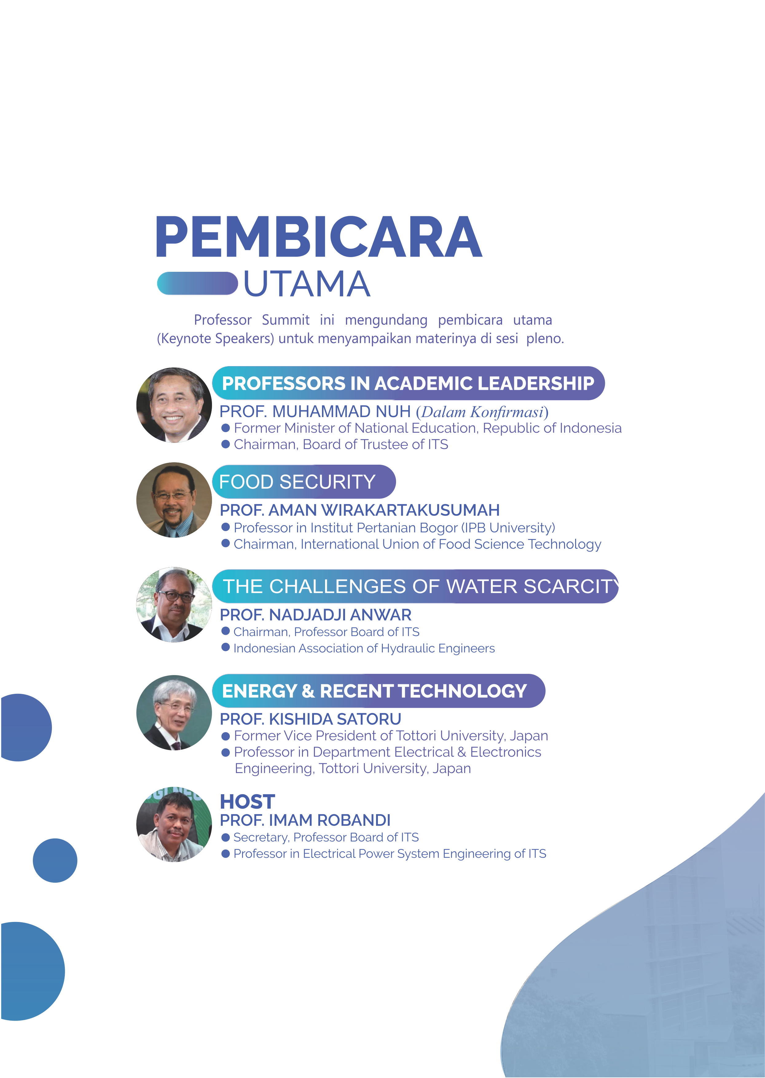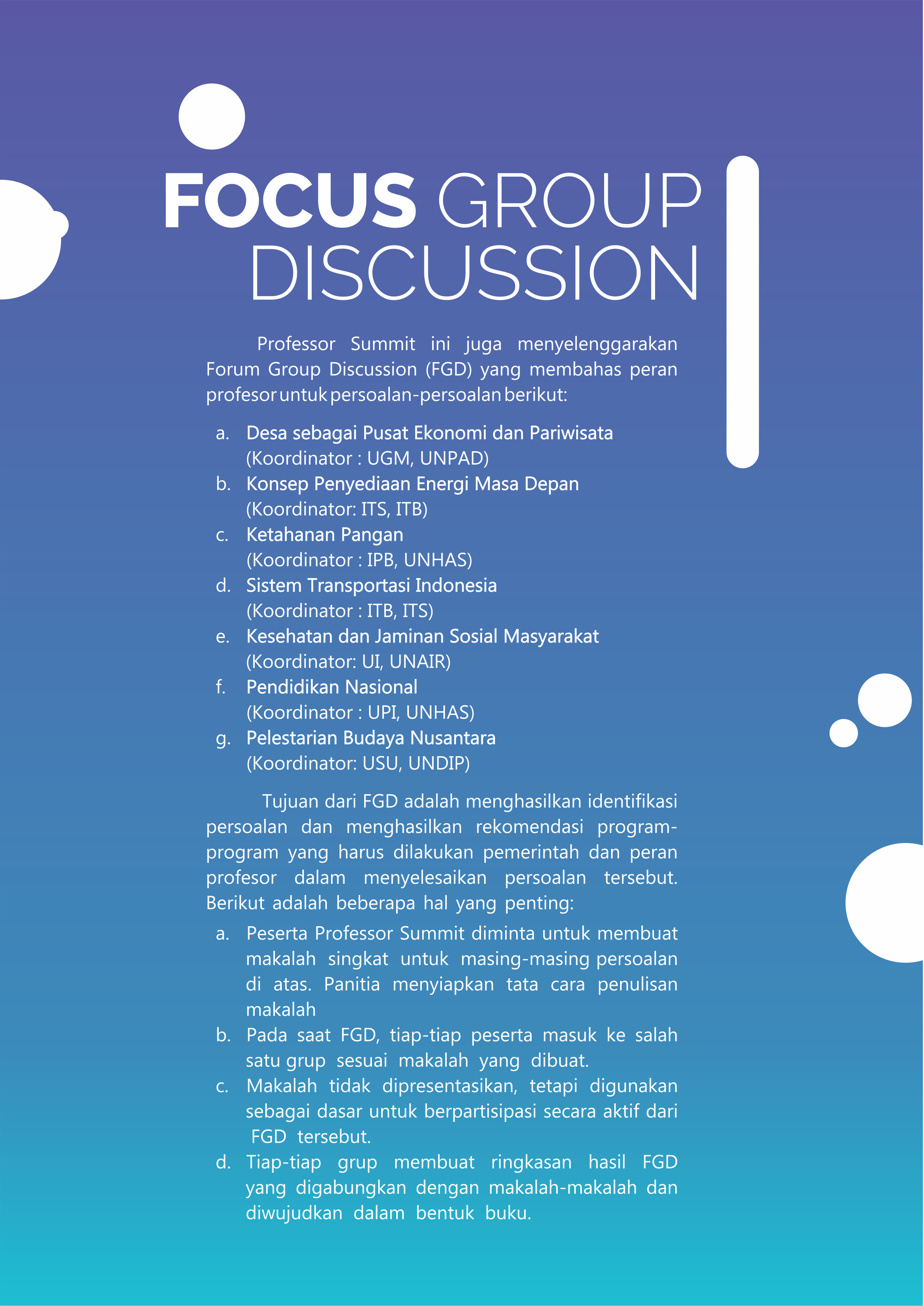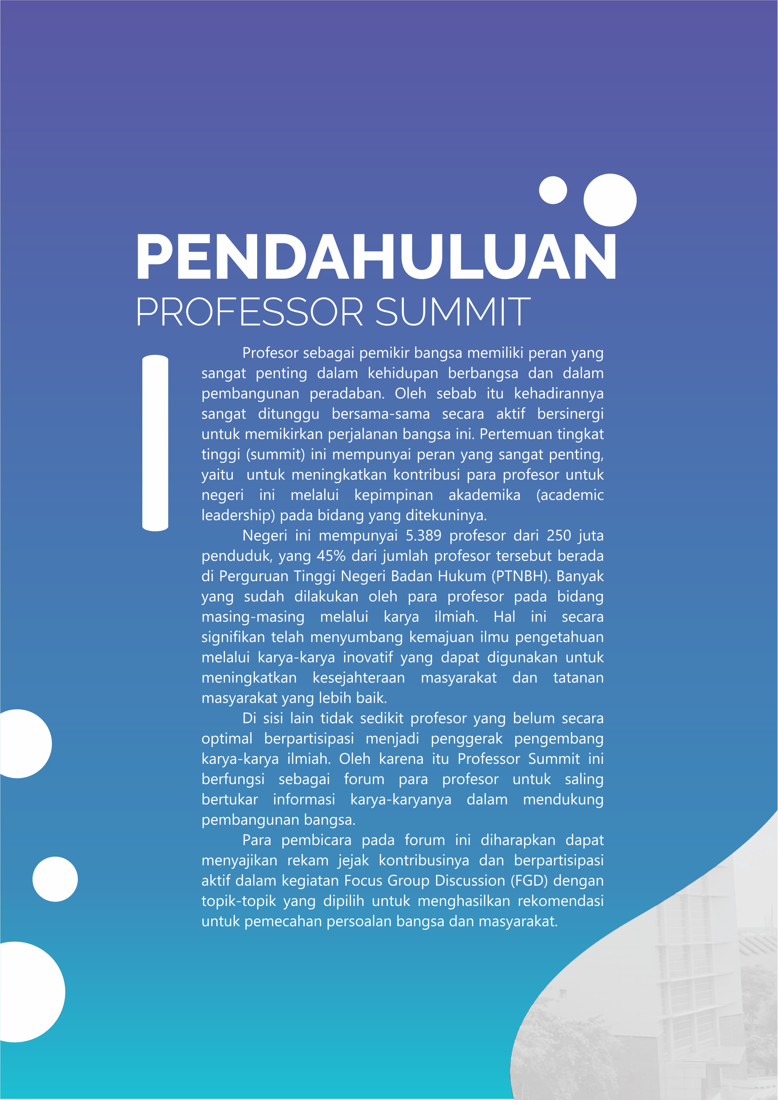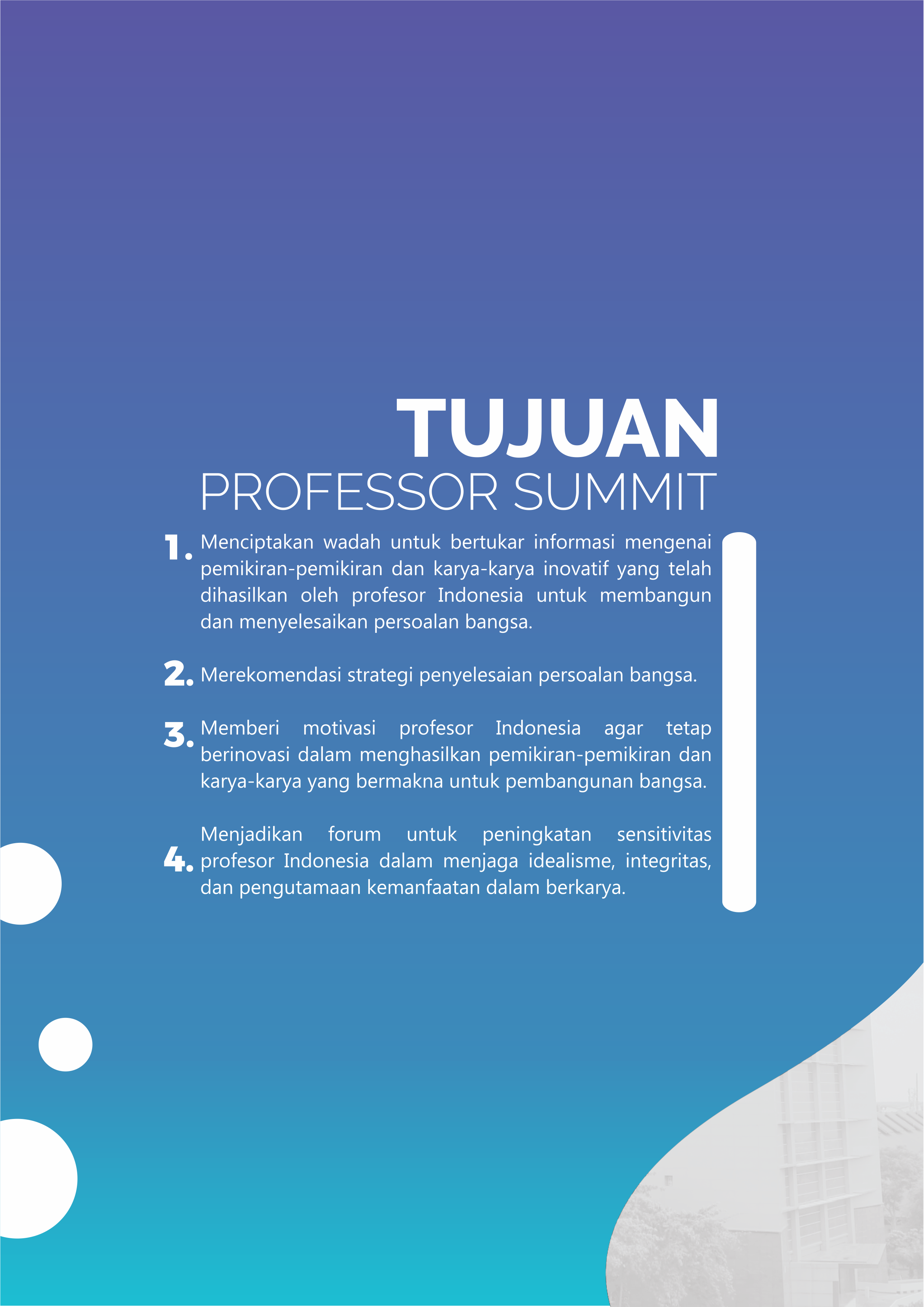 Di sisi lain tidak sedikit profesor yang belum secara optimal berpartisipasi menjadi penggerak pengembang karya-karya ilmiah. Oleh karena itu Professor Summit ini berfungsi sebagai forum para profesor untuk saling bertukar informasi karya-karyanya dalam mendukung pembangunan bangsa.