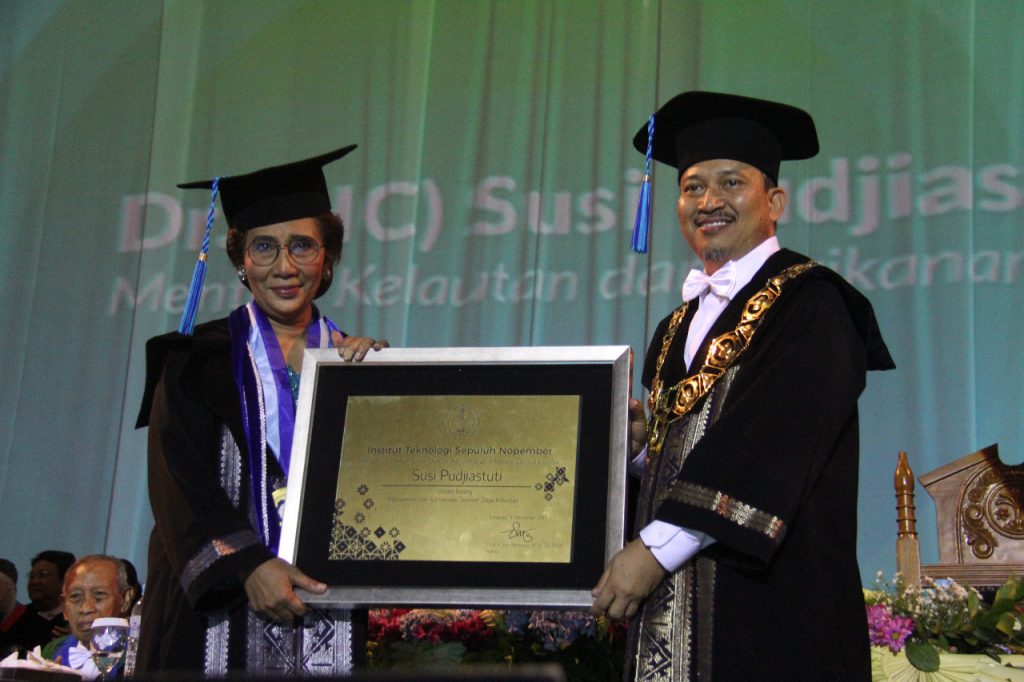 Menteri Kelautan dan Perikanan RI, Susi Pudjiastuti menerima gelar doktor kehormatan dari Rektor ITS, Prof Ir Joni Hermana, MScEs PhD