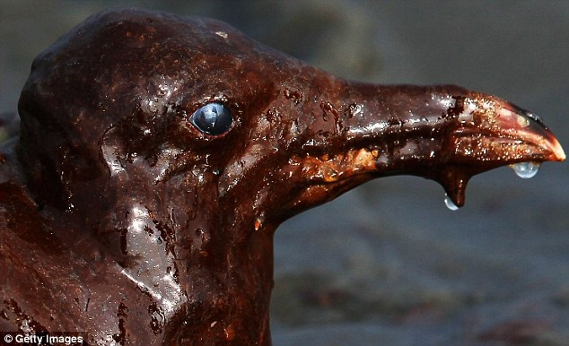 Pelikan yang menjadi korban kerusakan ekologis akibat kebocoran minyak di Deepwater Horizon, April 2010 (sumber: dailymail.co.uk)