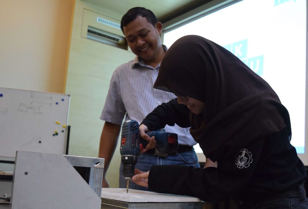 Salah seorang mahasiswi Arsitektur ITS ketika melakukan simulasi pemasangan gypsum