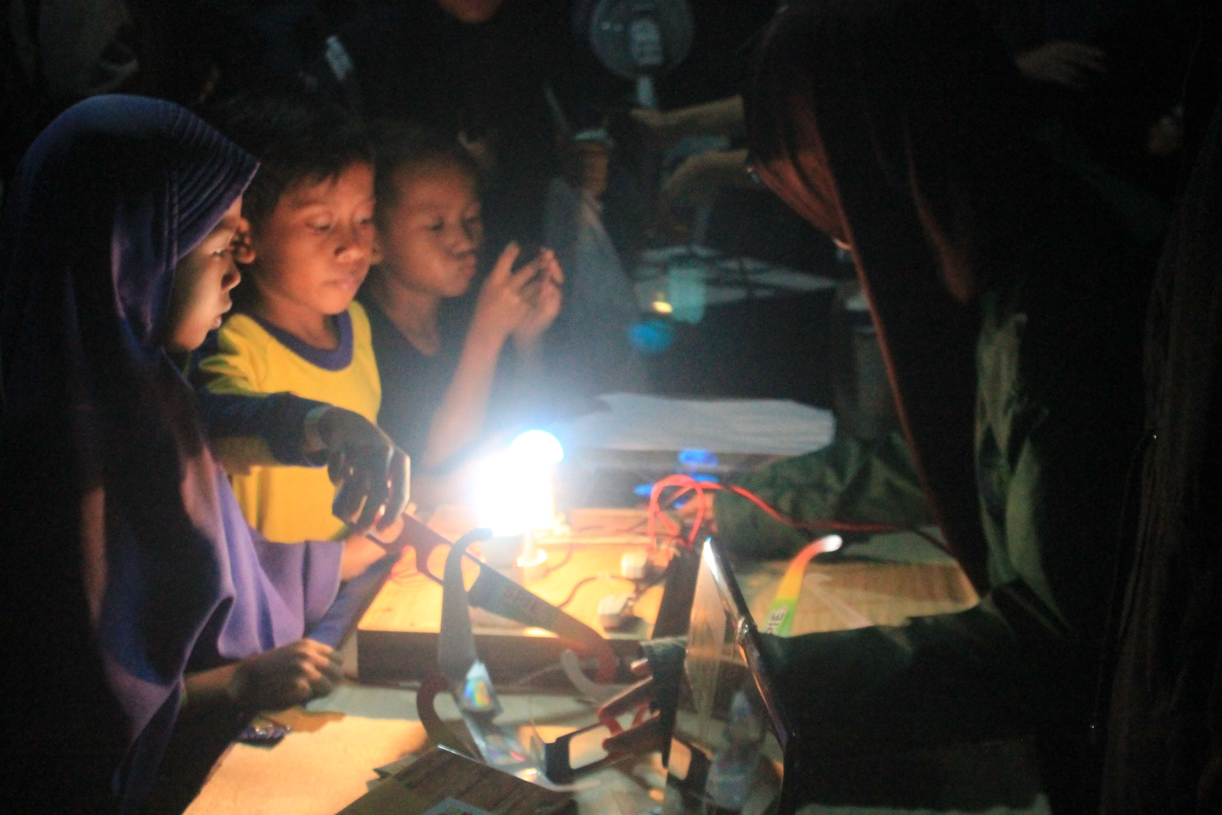 Anak-anak di Keputih Tegal Baru RW 8, tengah menyaksikan simulasi di wahana teknologi MKT