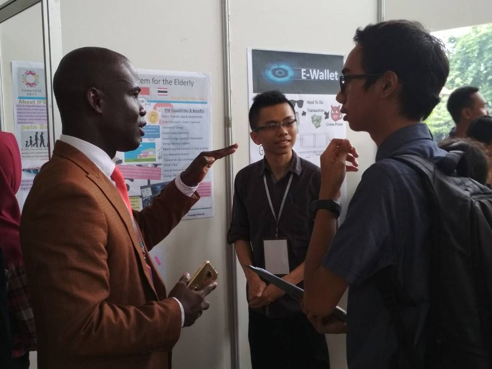 Peserta CommTECH memamerkan proyek inovasinya kepada salah seorang pengunjung