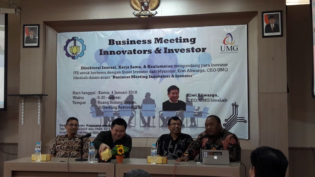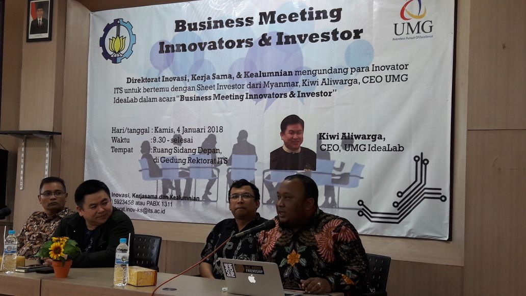 Surabaya-ITS News, Direktorat IKK (Inovasi Kerjasama dan Kealumnian) Institut Teknologi Sepuluh Nopember Surabaya menggebrak awal tahun 2018 dengan mengadakan acara Business Meeting Inventor dengan Investor di Gedung Rektorat ITS pada 4-5 Januari lalu. Acara ini diinisiasi sebagai pelengkap bagi innovator pemula yang ada di inkubator hingga PUI untuk didanai oleh investor swasta.