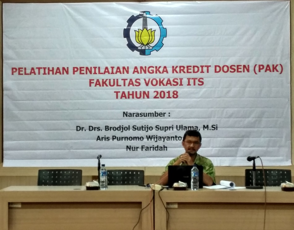 Gedung Rektorat, ITS News- Demi terwujudnya cita-cita ITS menjadi World Class University (WCU) 31 tenaga pendidik dan dosen Fakultas Vokasi mengikuti Pelatihan Penilaian Angka Kredit (PAK). Diisi oleh Dr Drs Brodjol Sutijo Supri Ulama M Si, sebanyak 31 dosen Fakultas Vokasi Institut Teknologi Sepuluh Nopember (ITS) didorong untuk mengejar publikasi ilmiahnya, Kamis (22/2).