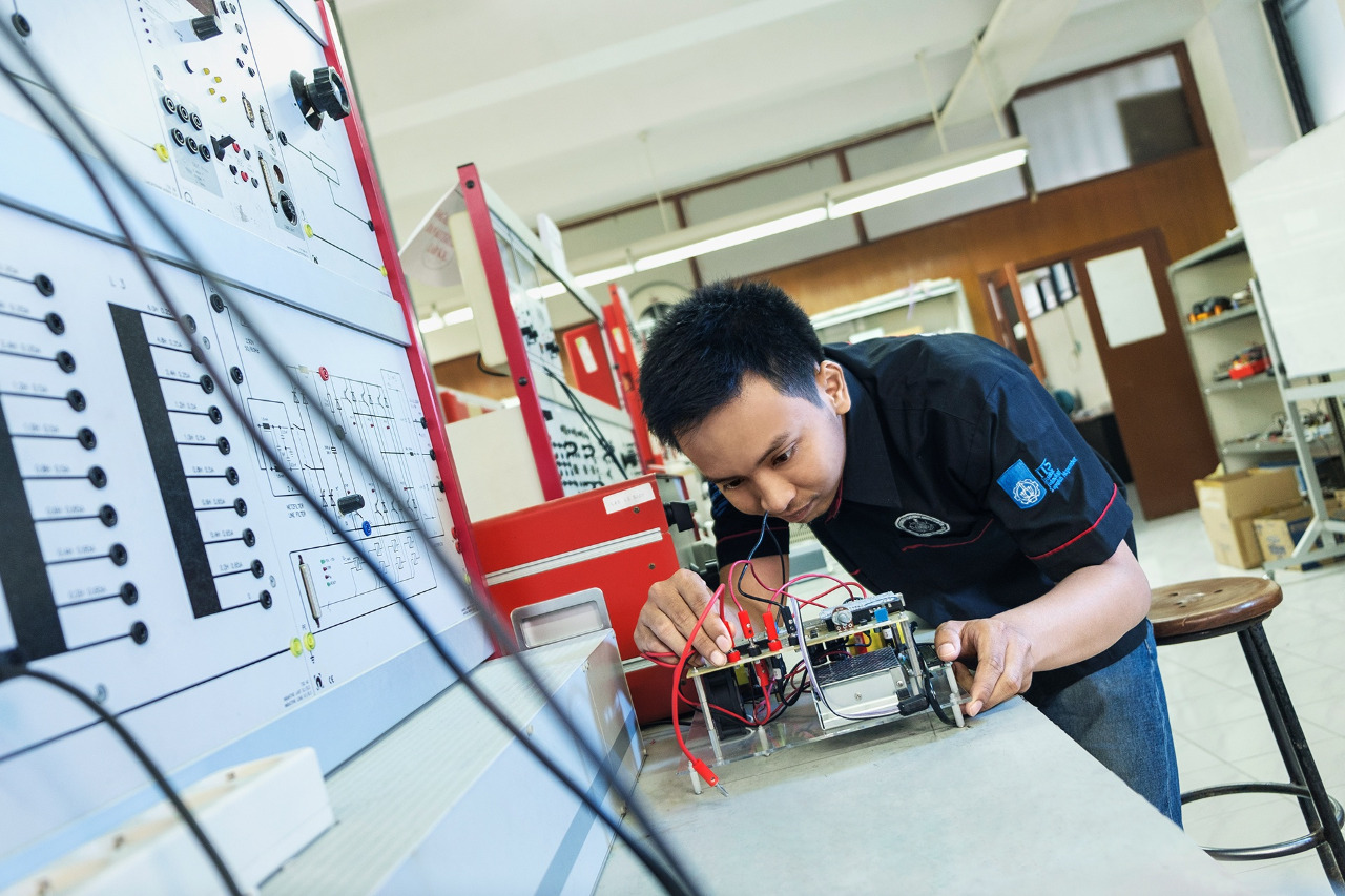 Mahasiswa DIII Teknik Elektro Otomasi sedang bereksperimen di laboratorium.
