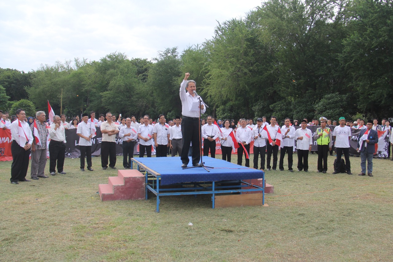 Rektor ITS, Prof Ir Joni Hermana, MScES PhD memimpin orasi dan ikrar ITS dalam aksi kebersamaan di Taman Alumni ITS.