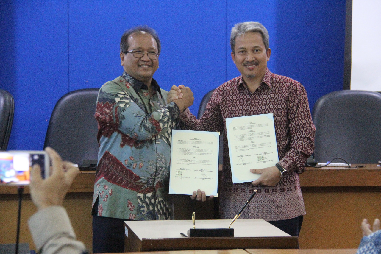 Rektor ITERA Prof Ir Ofyar Z Tamin MSc Eng PhD (kiri) dan Rektor ITS Prof Ir Joni Hermana MScES PhD usai penandatanganan MoU.