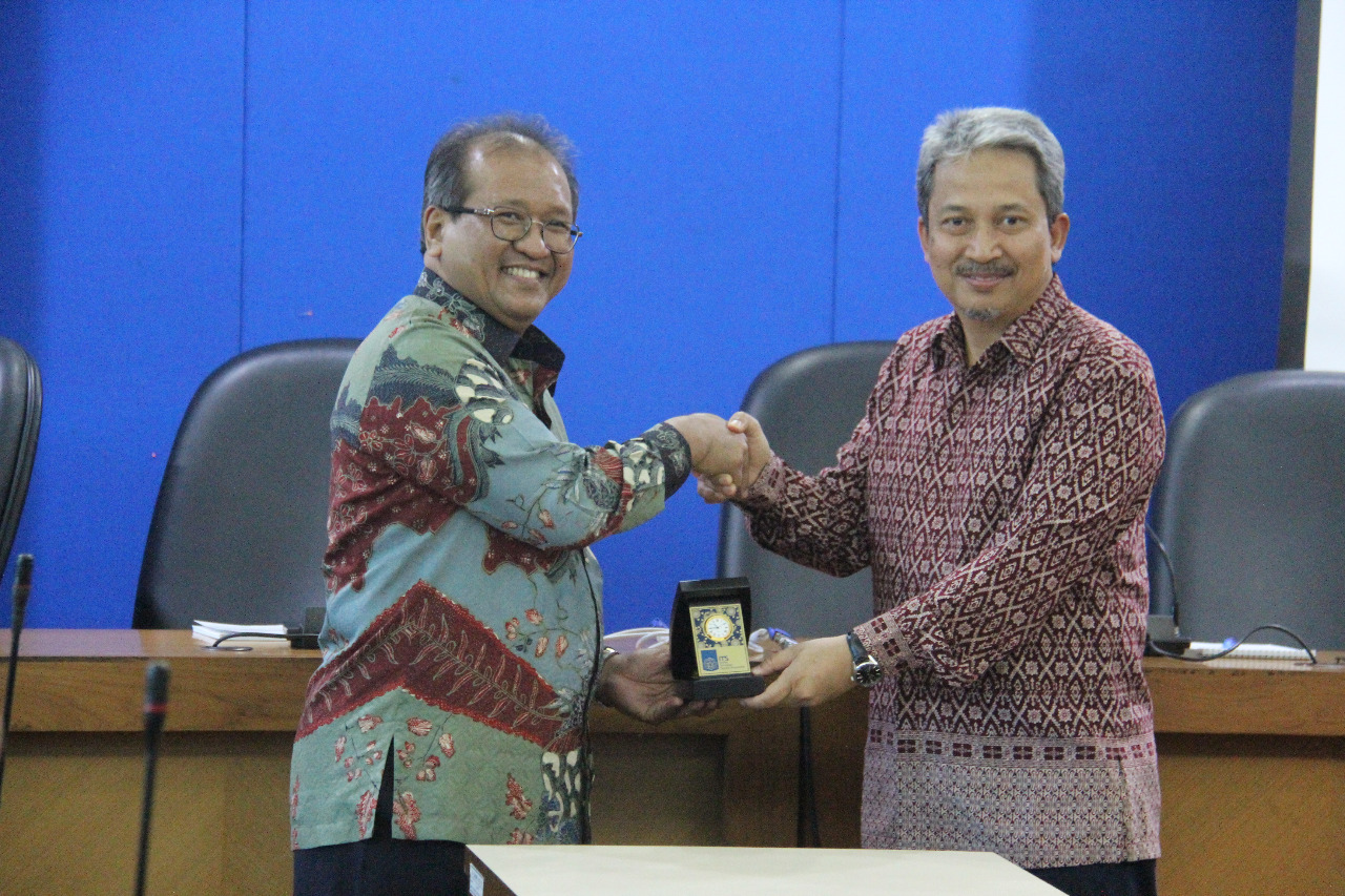 Rektor ITERA Prof Ir Ofyar Z Tamin MSc Eng PhD (kiri) menerima cinderamata dari Rektor ITS Prof Ir Joni Hermana MScES PhD.