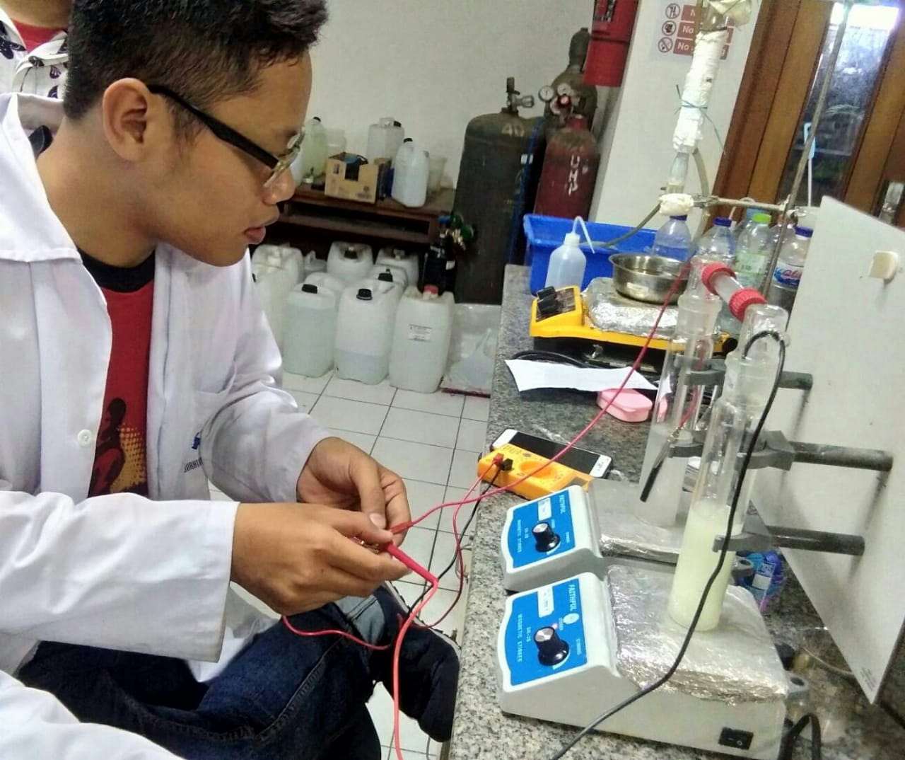 Rahadian Abdul Rachman, anggota tim, melakukan eksperimen di laboratorium Departemen Kimia ITS.