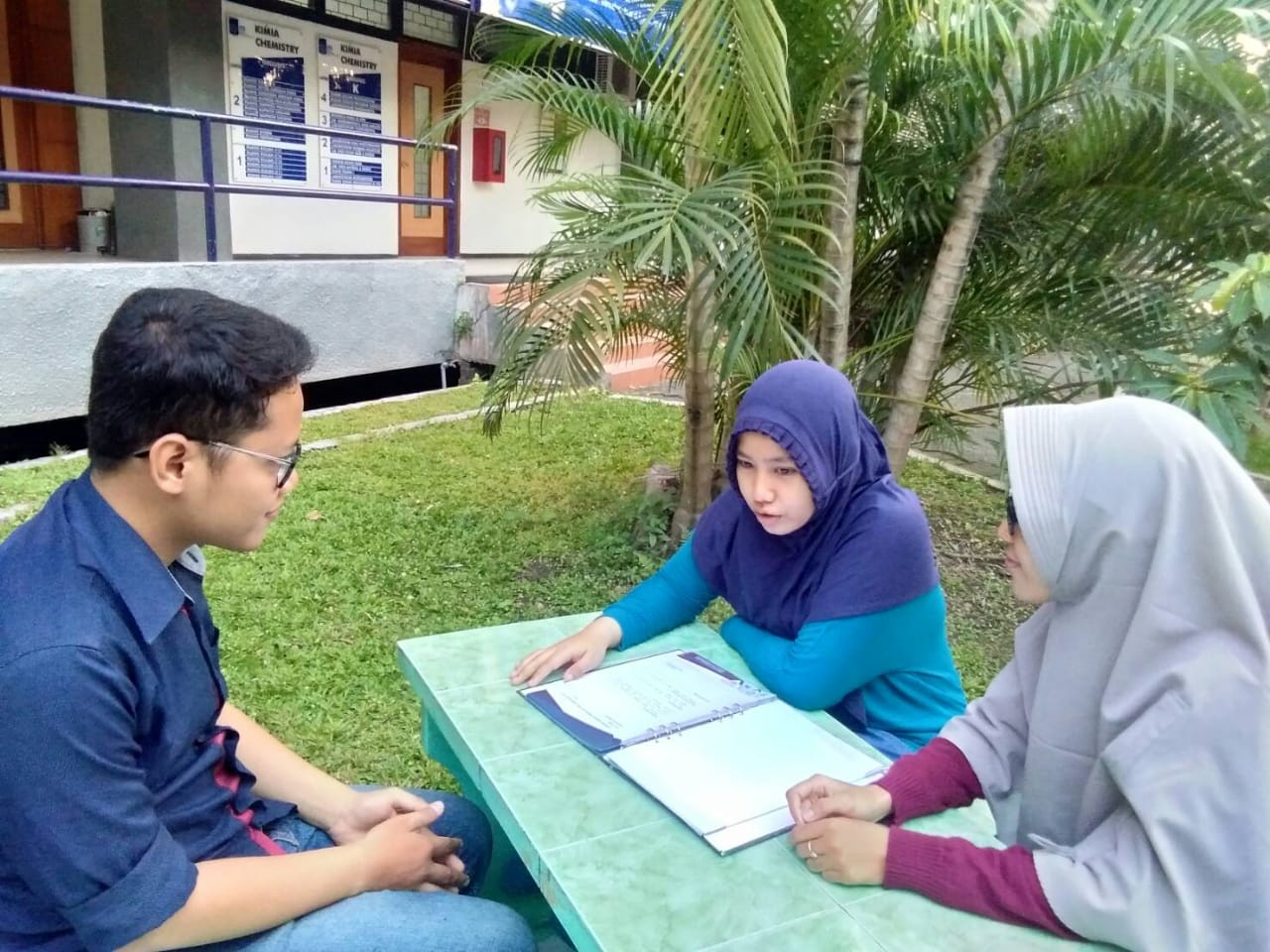 (Kiri ke kanan) Rahadian Abdul Rachman, Ulva Tri Ita Martia, dan Wulan Aulia saat berdiskusi di Taman Benzen, Departemen Kimia ITS.