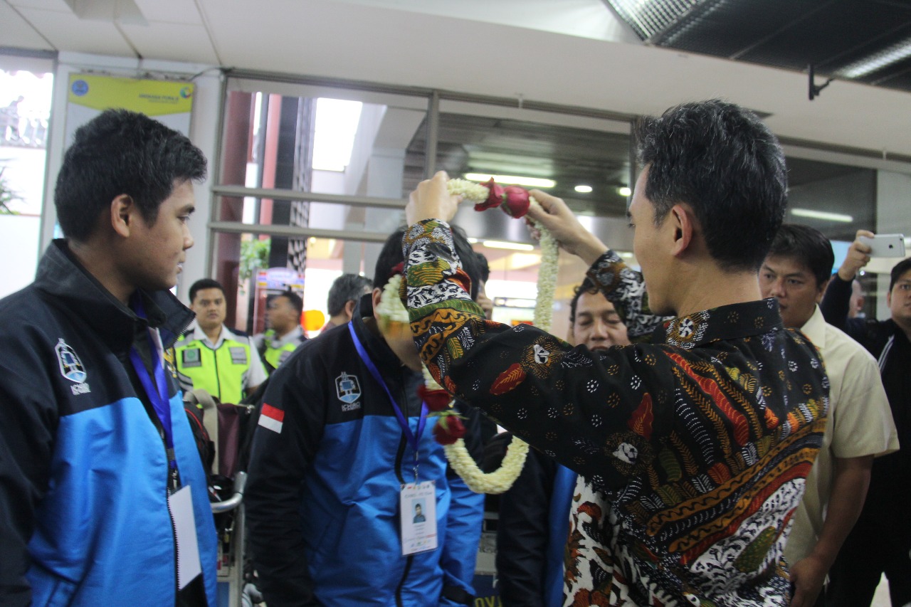 Tim Ichiro saat disambut oleh Deputi Bidang Pengembangan Pemuda Asrorun Ni’am di Bandara Soekarno Hatta.