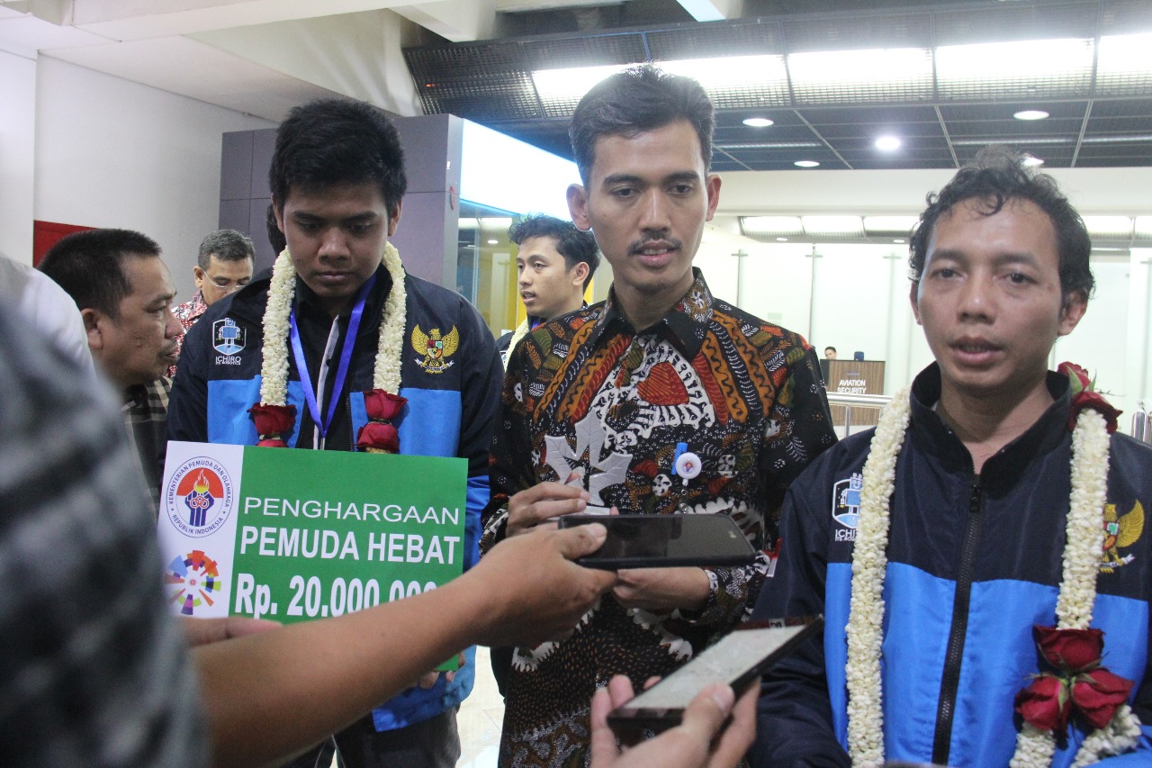 Dari kiri ke kanan, Ketua Tim Ichiro M Reza Ar Razi, Deputi 2 Kemenpora Asrorun Ni’am dan Dosen Pembimbing Tim Ichiro ITS Muhtadin saat diwawancara awak media di Bandara.