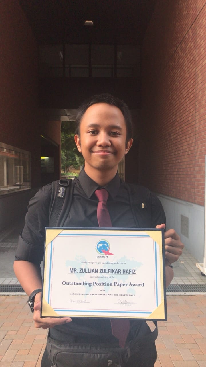 Zullian Zulfikar Hafiz, peraih penghargaan Outstanding Position Paper Award dalam Japan English Model United Nations (JEMUN) di Osaka, Jepang.