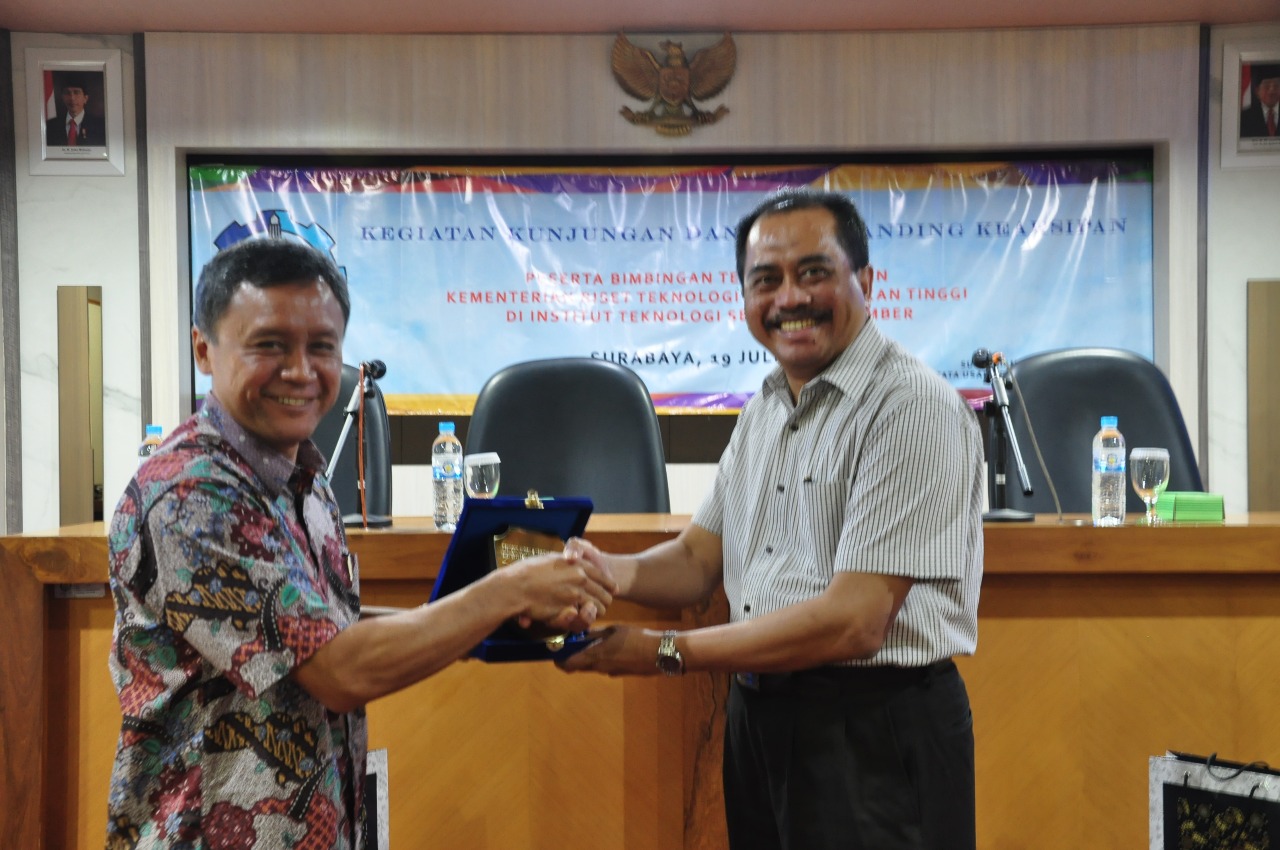 Mulyono SH (kiri) menerima cinderamata dari Wakil Rektor III ITS Prof Ir Arif Djunaidy MSc PhD.
