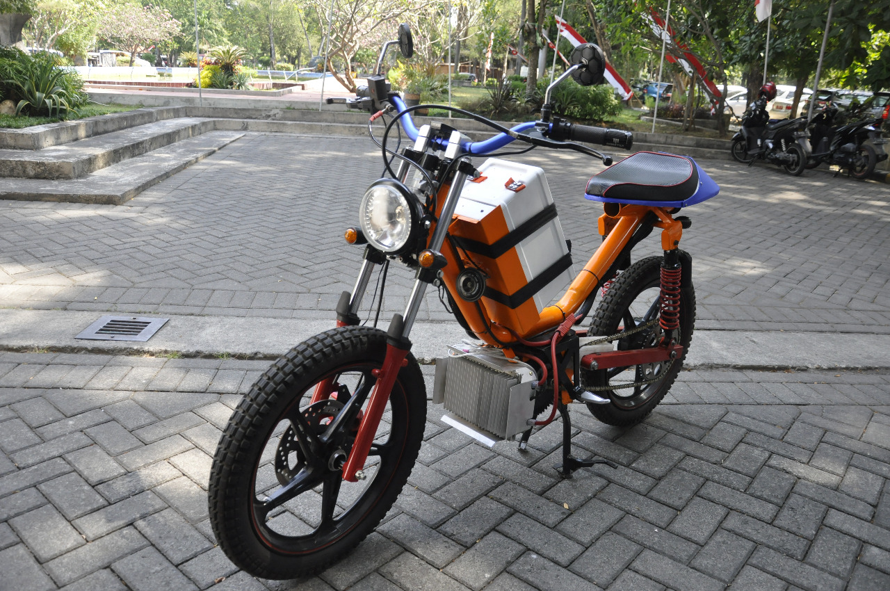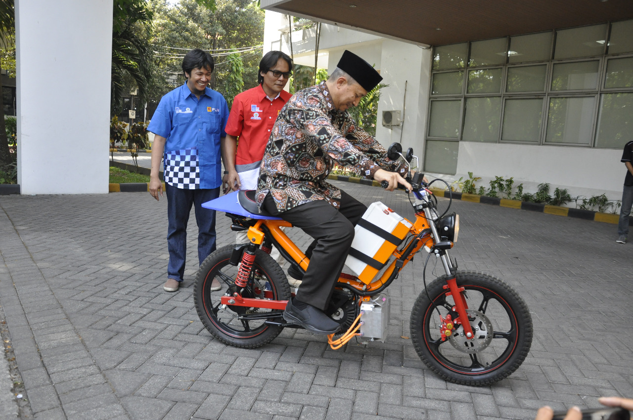 Rektor ITS saat mencoba motor listrik ditemani dengan Direktur PUI-SKO ITS, Dr Muhammad Nur Yuniarto ST (berbaju merah).