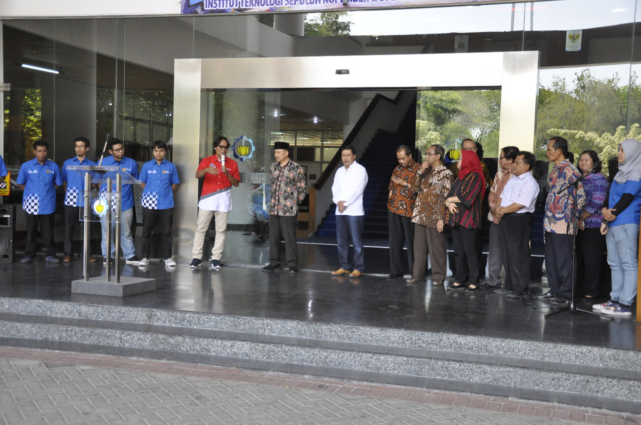 Direktur PUI-SKO ITS, Dr Muhammad Nur Yuniarto ST (berbaju merah) saat memberikan sambutan pada pemberangkatan tim PLN BLITS Explore Indonesia.