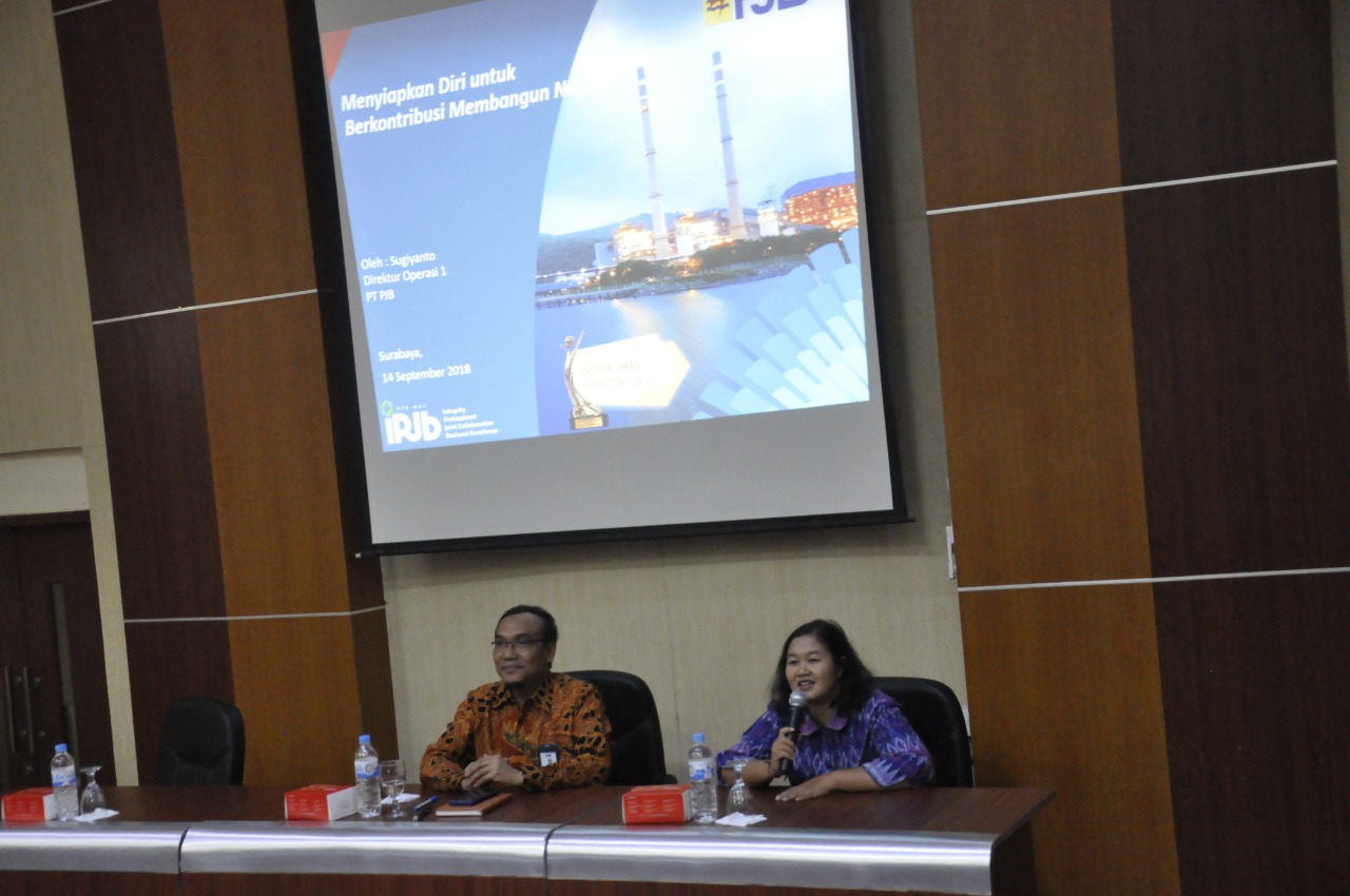 Sugiyanto MT, Direktur Operasi 1 PT PJB bersama moderator, saat memotivasi dan sharing pengalaman di dunia kerja kepada para mahasiswa ITS