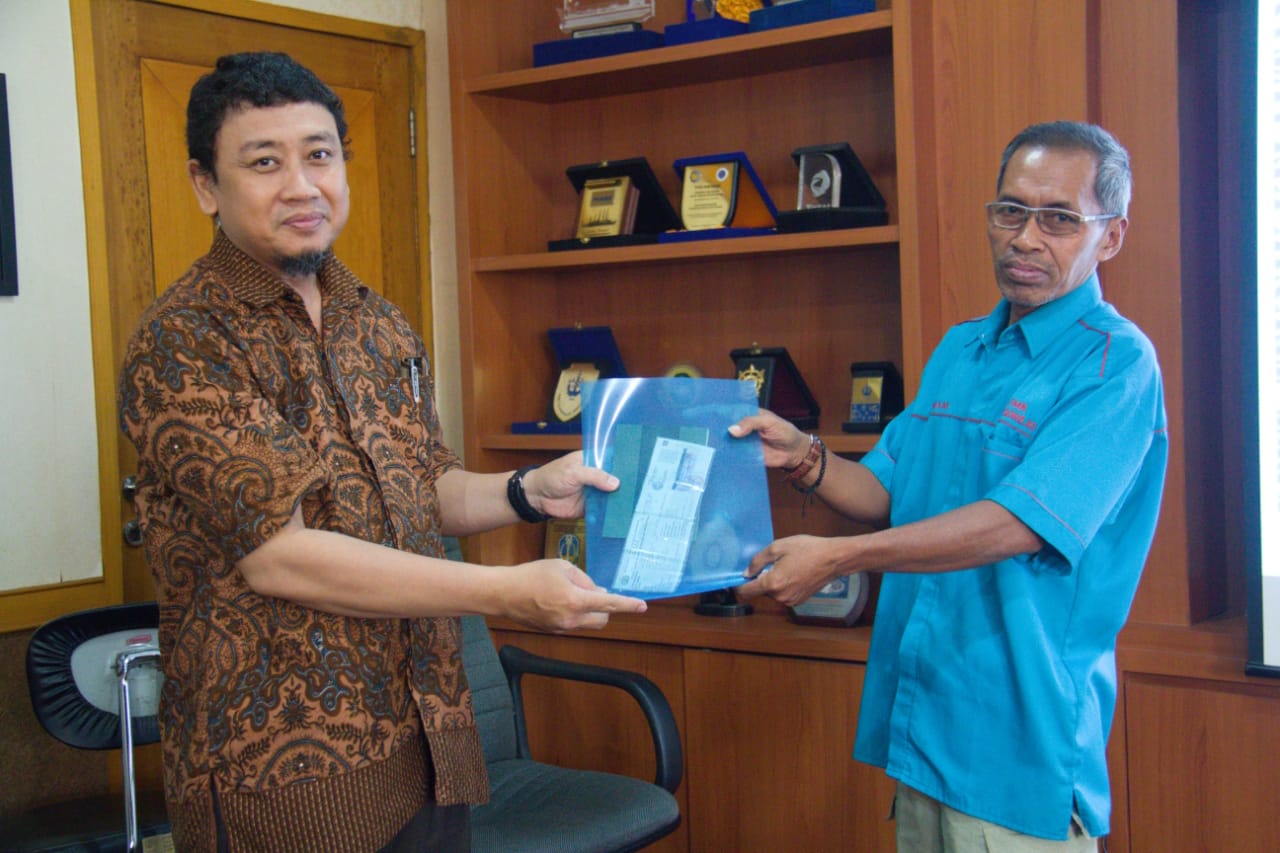 Serah terima dokumen Damkar Mini oleh Kadep DTK ITS Dr Eng Rudi Walujo Prastianto (kiri) kepada Umam Ketua LPMK Kelurahan Margorejo