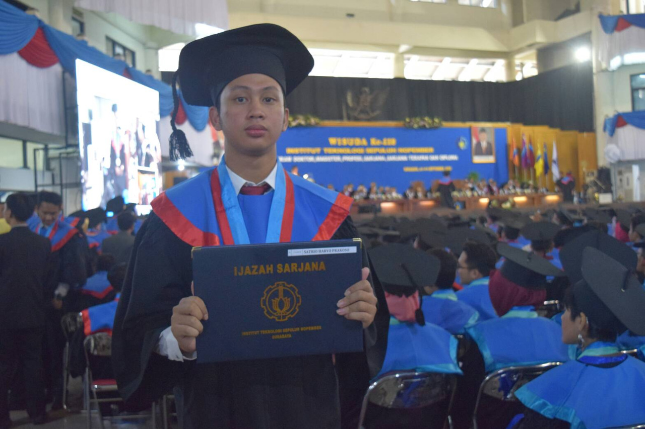 Satriyo Menunjukkan Ijazahnya Setelah Prosesi Wisuda. Satriyo adalah anggota tim Sapuangin ITS yang mengalami kecelakaan saat uji coba mobil sesaat sebelum kompetisi di Jepang.