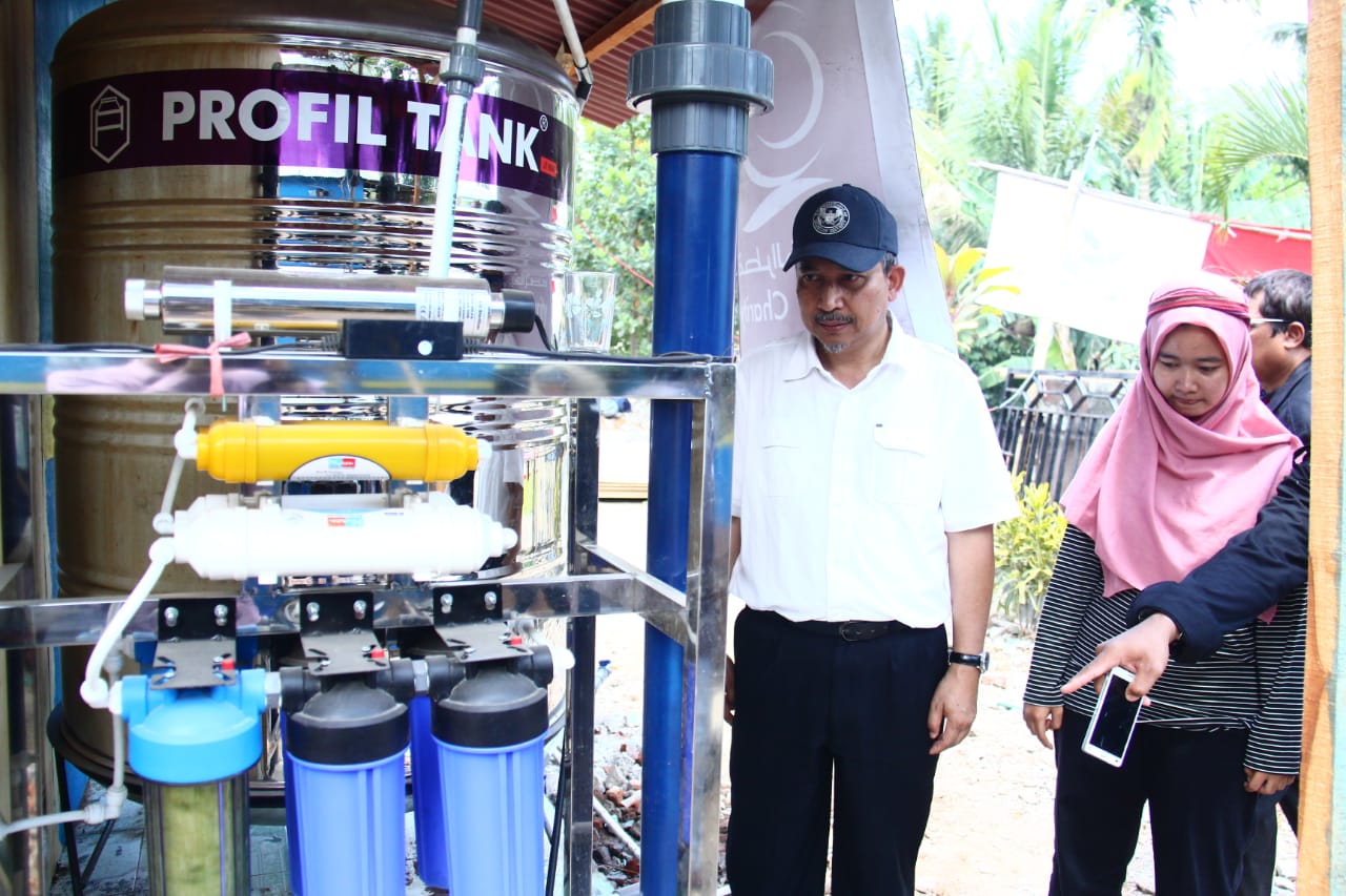 Rektor ITS Prof Joni Hermana saat meninjau kelayakan air bersih di Posko Tanggap Bencana ITS di Desa Rempek Darussalam