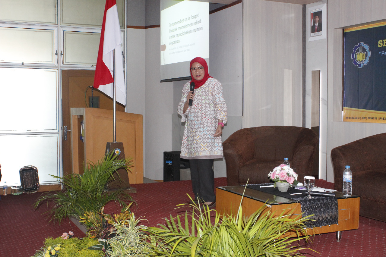 Kampus ITS, ITS News – Pada istilah kearsipan, manajemen organisasi atau catatan (record) berperan sangat penting untuk penyusunan arsip yang baik. Untuk menciptakan memori organisasi, diperlukan adanya manajemen record yang baik. Hani Qonitah S IP M IMS , Information Management Servises (IMS) Supervisor Exxon Mobil Corporation memberikan informasi mengenai praktek praktek manajemen record untuk menciptakan memori organisasi dihadapan peserta Seminar Nasional Kearsipan ITS 2018, Kamis (4/10) lalu.