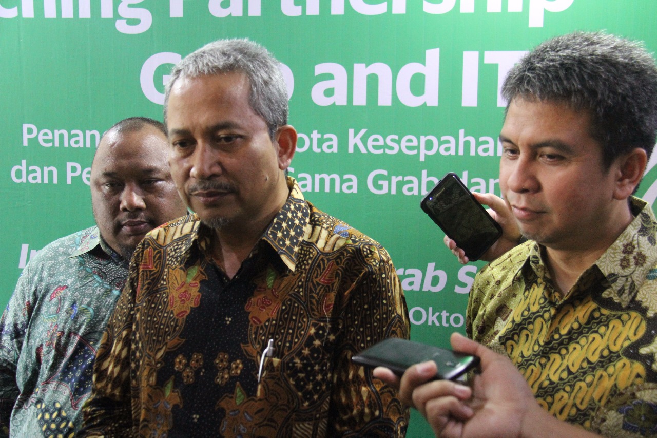 Managing Director Grab Ridzki Kramadibrata (kanan) bersama Rektor ITS Prof Joni Hermana (tengah) saat memberi keterangan pada pers