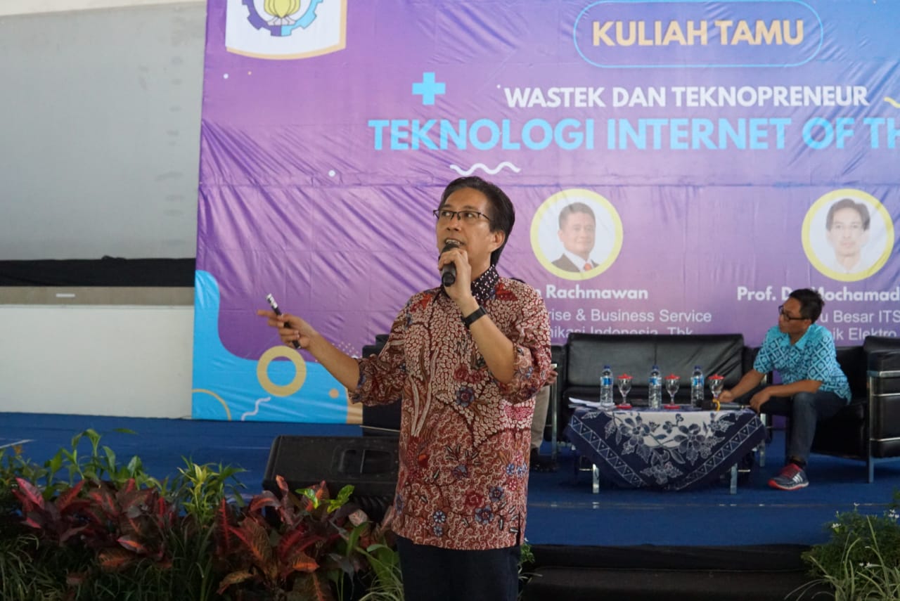 Kampus ITS, ITS News – Institut Teknologi Sepuluh Nopember (ITS) Surabaya menyelenggarakan kuliah tamu Wawasan Teknologi dan Teknopreneur, Sabtu (27/10). Mengangkat topik Teknologi Internet of Things (IoT), kegiatan yang dilaksanakan di Gedung Robotika ITS ini menghadirkan Director of Enterprise and Business Service PT TELKOM INDONESIA, Tbk, Diar Rachmawan sebagai pembicara.