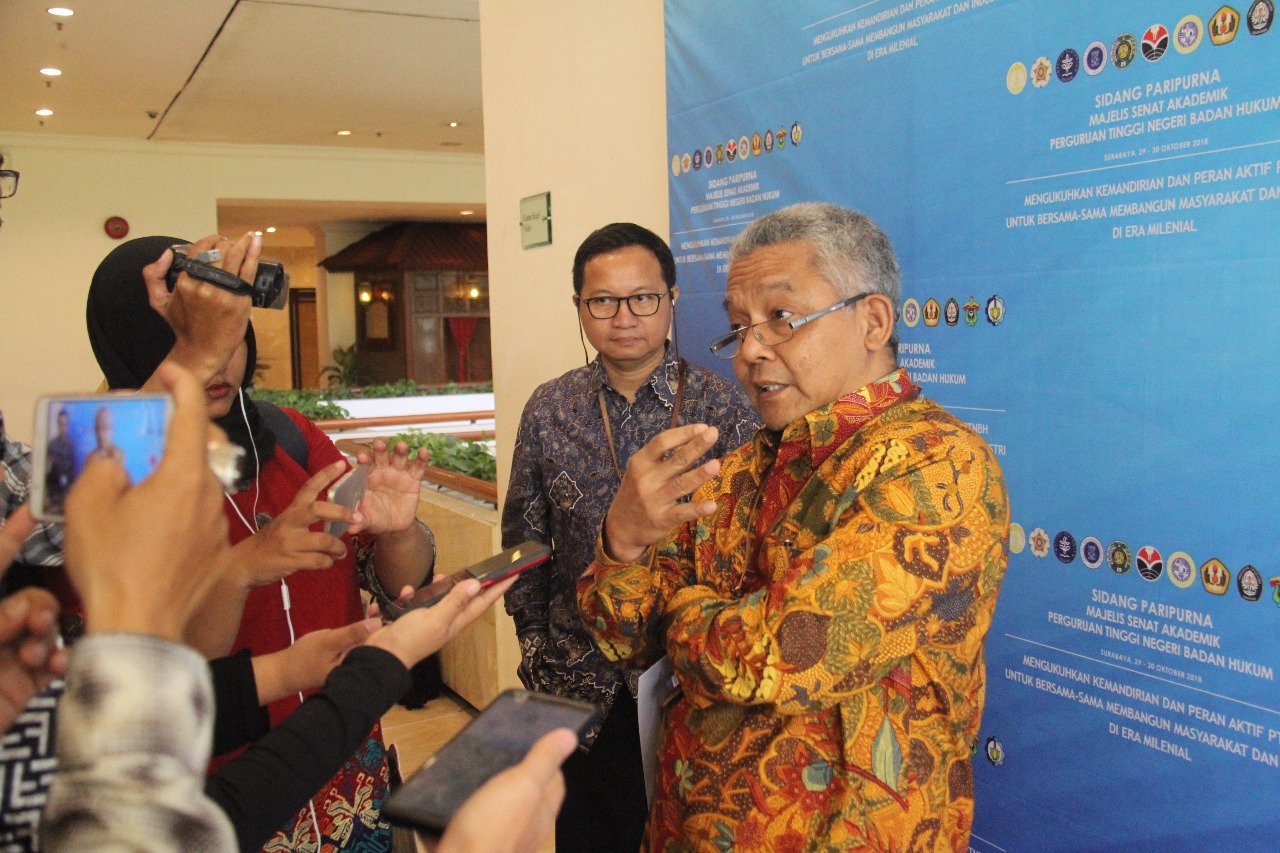Kampus ITS, ITS News – Sejak berubahnya status 11 Perguruan Tinggi Negeri (PTN) menjadi PTN Berbadan Hukum (PTNBH) yang memiliki otonomi sendiri sejak tahun 2014 melalui Peraturan Pemerintah (PP) No. 81 Tahun 2014, ternyata masih menyisakan pertanyaan seperti apakah otonomi yang dimiliki oleh PTNBH ini. Hal tersebut dibahas secara lebih mendalam oleh 11 PTNBH pada Sidang Parpurna Majelis Senat Akademik (MSA) PTNBH yang mendaulat Institut Teknologi Sepuluh Nopember (ITS) Surabaya sebagai tuan rumah di Isyana Ballroom, Hotel Bumi Surabaya, (30/10).