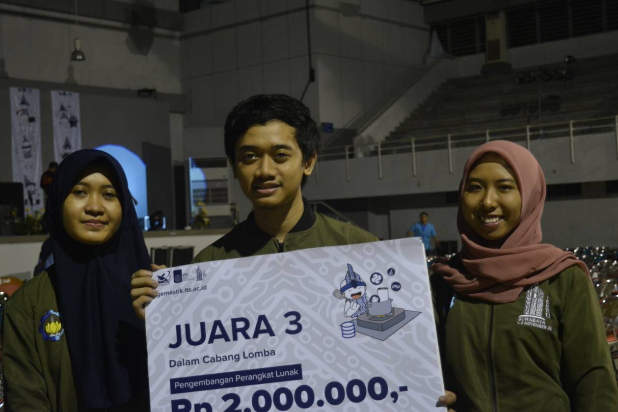 Reynata Tri Damayanti (kiri), Ahmad Nur Salim (tengah), dan Siti Aminatus Zehroh (kanan) berfoto ketika mendapat penghargaan di Gemastik 11