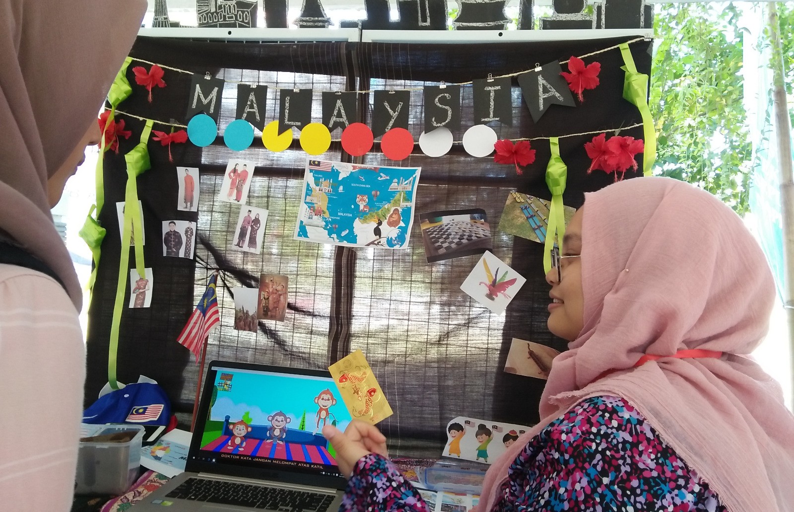 Mahasiswa asing asal Malaysia saat sedang berinteraksi dengan mahasiswa ITS yang berkunjung ke booth-nya dalam Global Unity Fair 2018