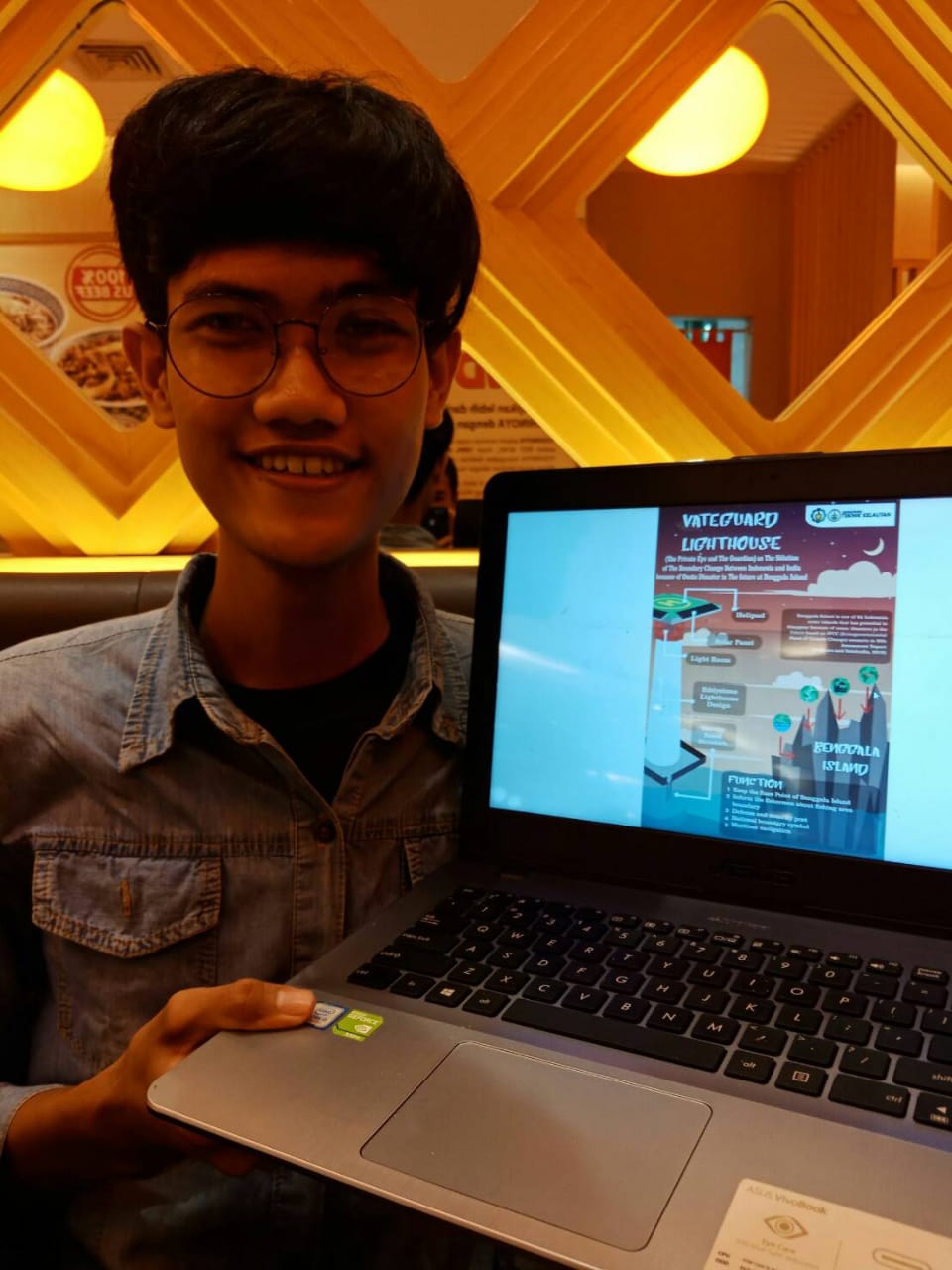 Muhammad Rizky Syarifudin menunjukkan gambaran gagasan timnya soal mercusuar Vateguard