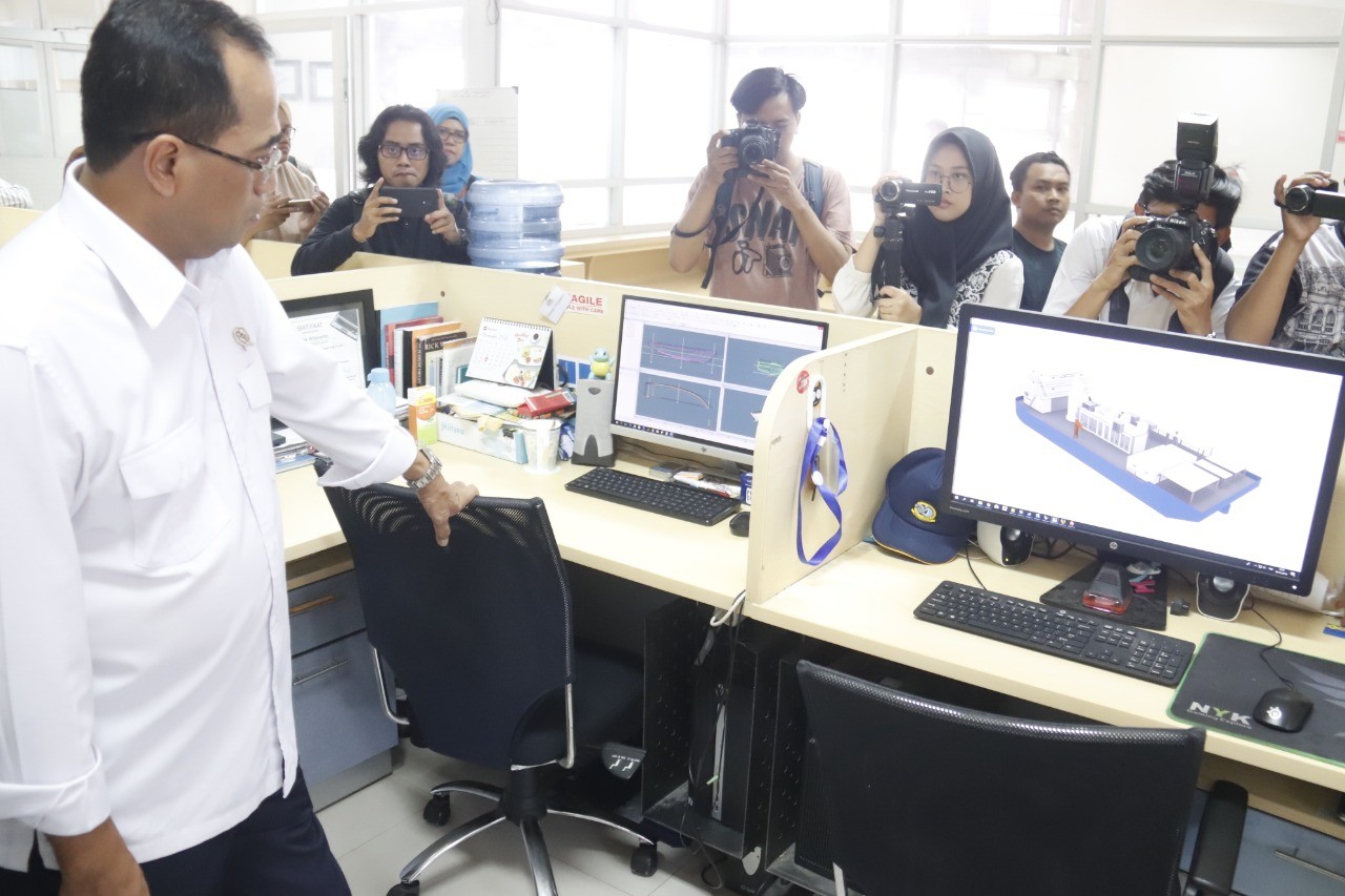 Menhub Budi Karya Sumadi (kiri) saat meninjau desain kapal yang siap hilirisasi karya ITS di gedung NaSDEC