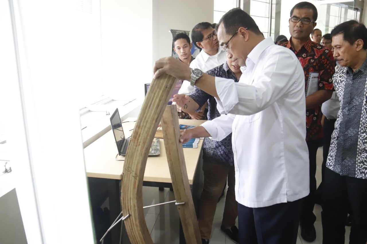 Kampus ITS, ITS News – Berbagai inovasi di bidang kelautan karya Institut Teknologi Sepuluh Nopember (ITS) menarik minat Menteri Perhubungan Republik Indonesia (Menhub RI), Budi Karya Sumadi, untuk langsung berkunjung ke kampus Pahlawan ini, Jumat (30/11). Salah satunya yang paling menarik perhatian Menhub adalah kapal bambu Baito Deling.