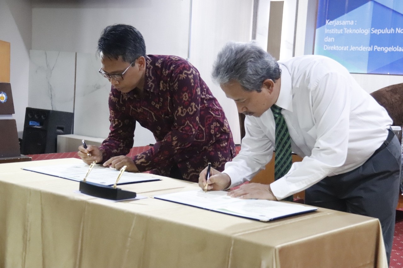 Rektor ITS Prof Joni Hermana (kanan) dan Kepala Subdirektorat Analis Keuangan Kemenkeu RI Suharianto menandatangani MoU perihal Pendidikan, Penelitian dan Pengmas