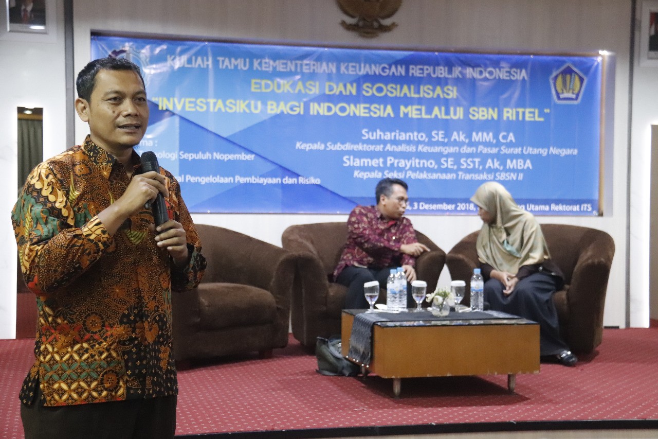 Kampus ITS, ITS News – Masuknya negara Indonesia dalam era persaingan ekonomi global yang semakin ketat, mengharuskan masyarakat Indonesia mampu untuk ikut serta dalam berinvestasi. Untuk menindaklanjuti hal itu, Institut Teknologi Sepuluh Nopember (ITS) Surabaya bekerja sama dengan Kementerian Keuangan (Kemenkeu) RI yang ditunjukkan melalui pendatanganan nota kesepahaman dan kuliah tamu di Ruang Sidang Utama, gedung Rektorat ITS, Senin (3/12).
