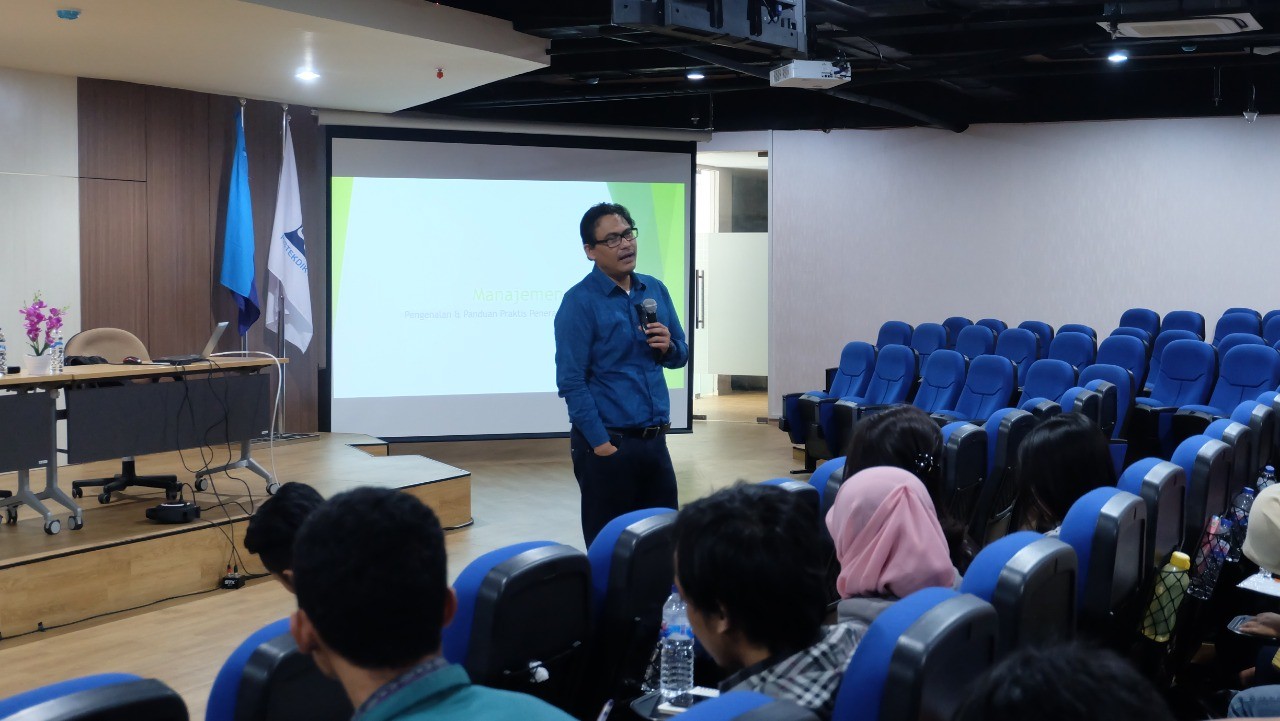 Negari Karunia Adi ST saat memaparkan seluk beluk manajemen risiko pada Seminar Manajemen Resiko, Sabtu (24/11) di Auditorium Sinar Mas Departemen Teknik Industri.