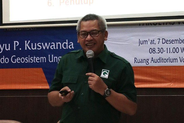 Direktur PT Teknindo Geosistem Unggul, Ir Wahyu P Kuswanda saat memberikan penjelasan pada kuliah tamu di Departemen Teknik Infrastruktur Sipil ITS
