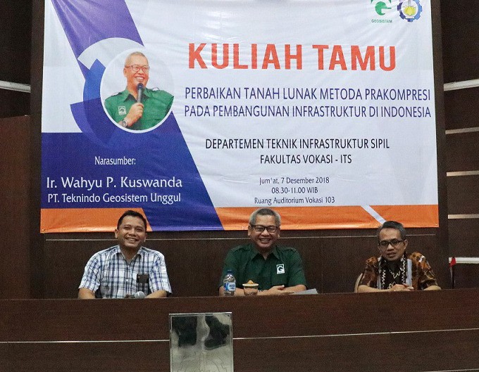 Kampus ITS Surabaya, ITS News – Kondisi tanah lunak kerap kali menjadi masalah yang menghambat percepatan pembangunan infrastruktur. Untuk itu, perlu adanya perbaikan melalui pemampatan awal atau prakompresi. Hal ini selaras dengan penuturan Ir Wahyu P Kuswanda dalam kuliah tamu yang digelar Departemen Teknik Infrastruktur Sipil, Institut Teknologi Sepuluh Nopember (ITS) Surabaya, Jumat (7/12).