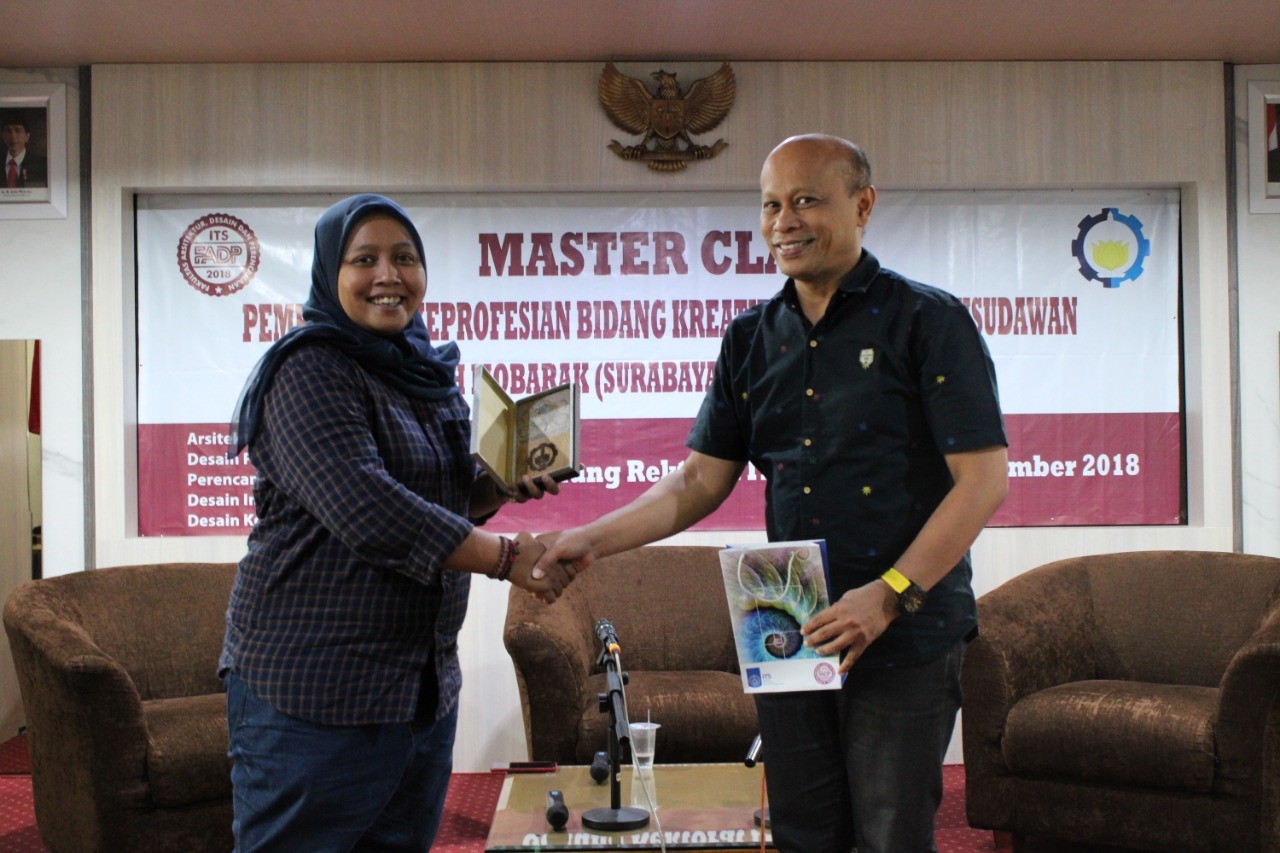 Penyerahan kenang-kenangan kepada Hafshoh Mubarak yang telah membagikan pengalamanya bergerak di Industri Ekonomi Kreatif kepada mahasiswa Fakultas Arsitektur Desain dan Perencanaan (FADP) ITS