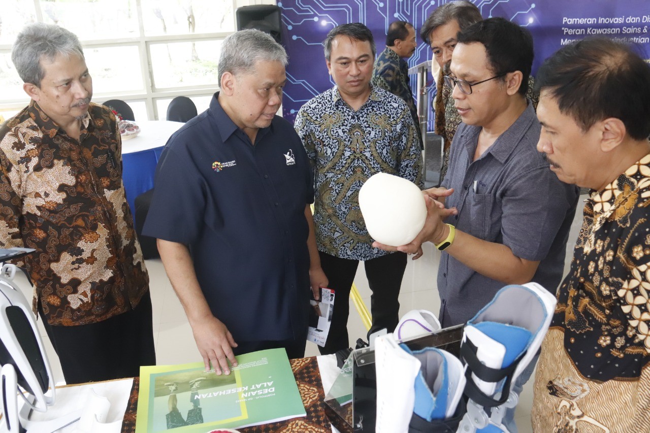 Dr Ir Patdono Suwignjo didampingi Rektor ITS, Wakil Rektor IV dan II ITS saat meninjau hasil riset berupa desain alat kesehatan yang dipamerkan di Gedung STP ITS