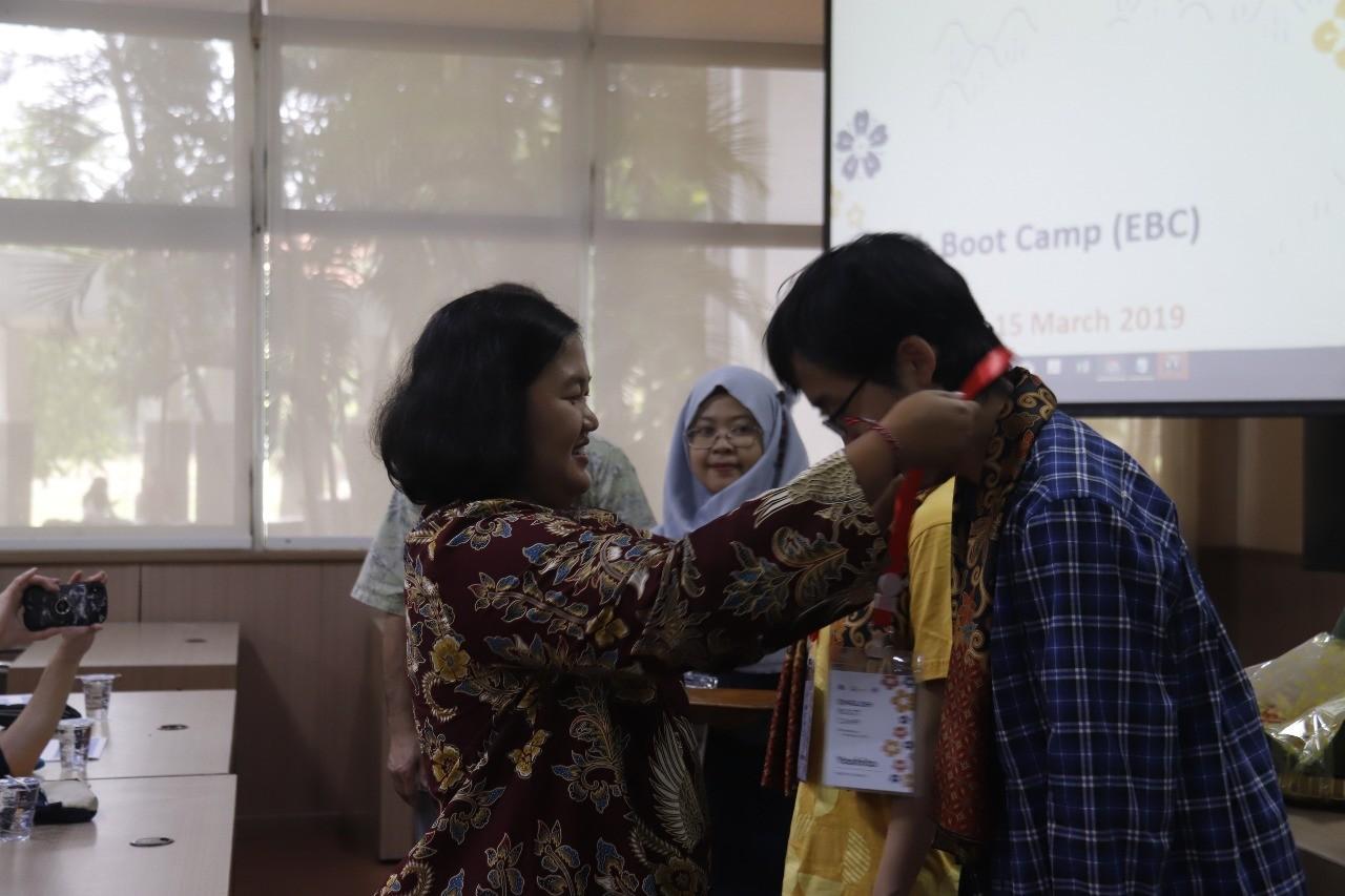 Dekan Fakultas Teknik Sipil, Lingkungan dan Kebumian (FTSLK) ITS, IDAA Warmadewanthi, memberikan syal sebagai simbol penerimaan peserta English Boot Camp