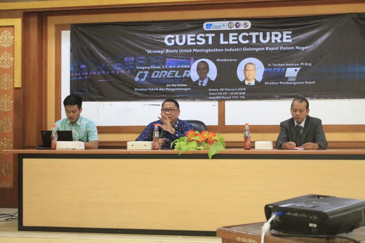 Kuliah tamu kali ini mendatangkan langsung dua pembicara profesional dari PT Orela Shipyard dan PT PAL. Adalah Soegeng Riyadi ST MT MRINA, Direktur Teknik dan Pengembangan PT Orela Shipyard, serta Ir Turitan Indaryo MEng, Direktur Pengembangan Kapal PT PAL.