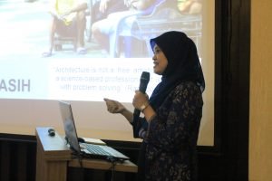 Dr Rita Ernawati ST MT sedang memaparkan penelitiannya dalam Sidang Terbuka Promosi Doktor di Ruang Sidang Djelantik Departemen Arsitektur ITS