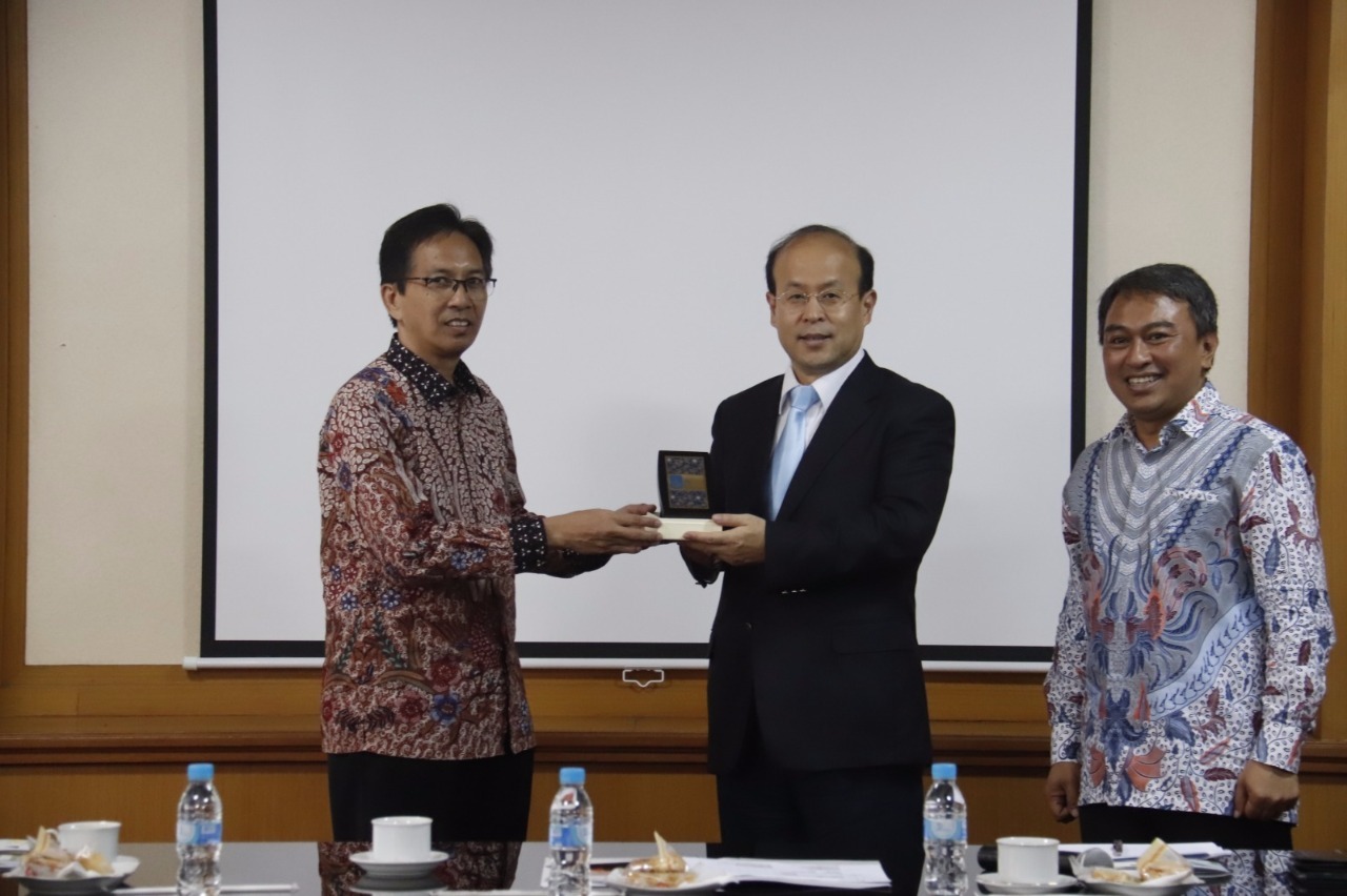 Penyerahan apresiasi kepada Duta Besar Tiongkok untuk Indonesia, Xiao Qian oleh Prof Dr Ir Mochamad Ashari M Eng (kiri) dan Prof Dr Ketut Buda Artana ST MSc (kanan)