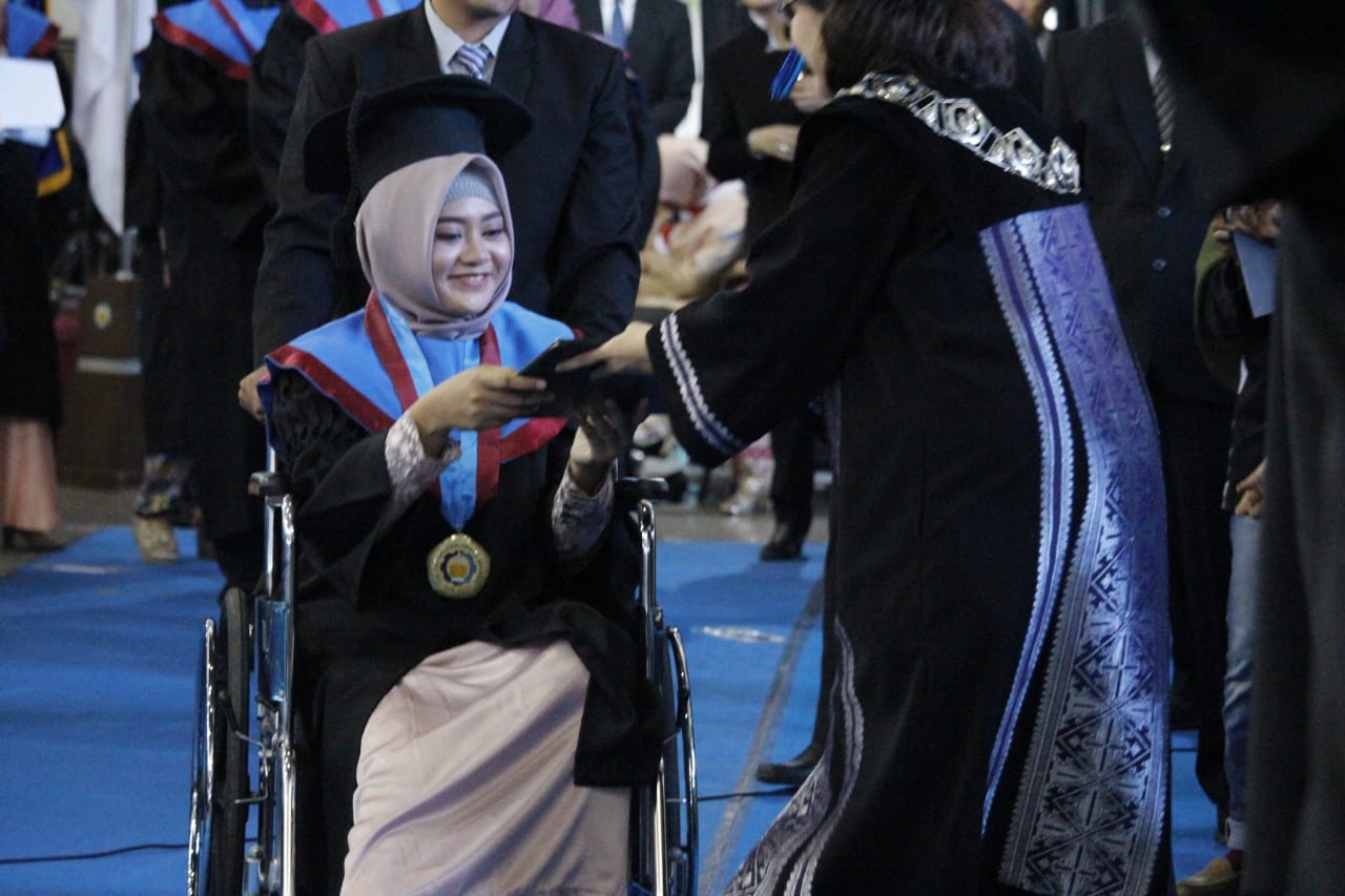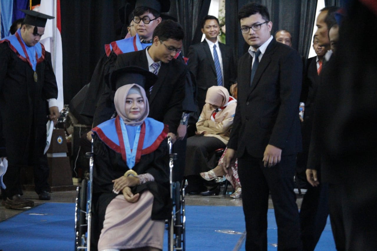 Kampus ITS, ITS News – Wisuda merupakan momentum yang paling bermakna bagi mahasiswa. Begitu pula untuk Ottidilia Nur Laily, salah satu wisudawan Institut Teknologi Sepuluh Nopember (ITS) Surabaya pada Wisuda ke-119, Sabtu (16/3). Mahasiswa yang masih cedera setelah mengalami kecelakaan sepeda motor ini tetap hadir meskipun harus menggunakan kursi roda.
