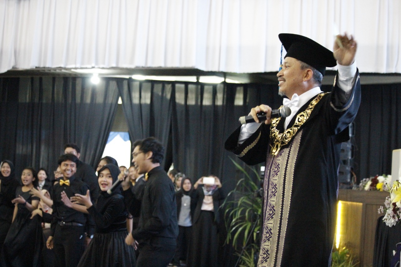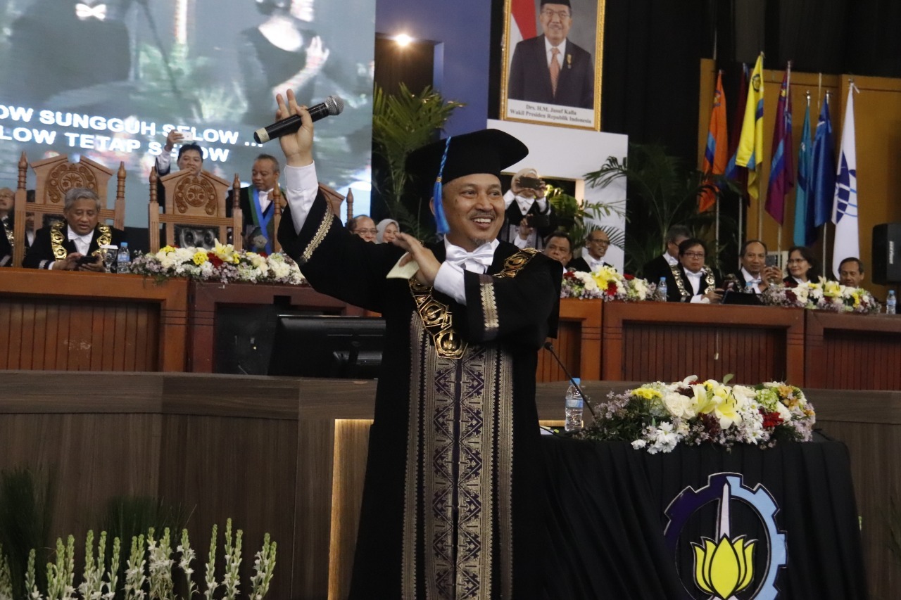 Prof Joni Hermana saat memberikan kejutan dengan menyanyikan lagu Selow di upacara wisuda ke-119 ITS